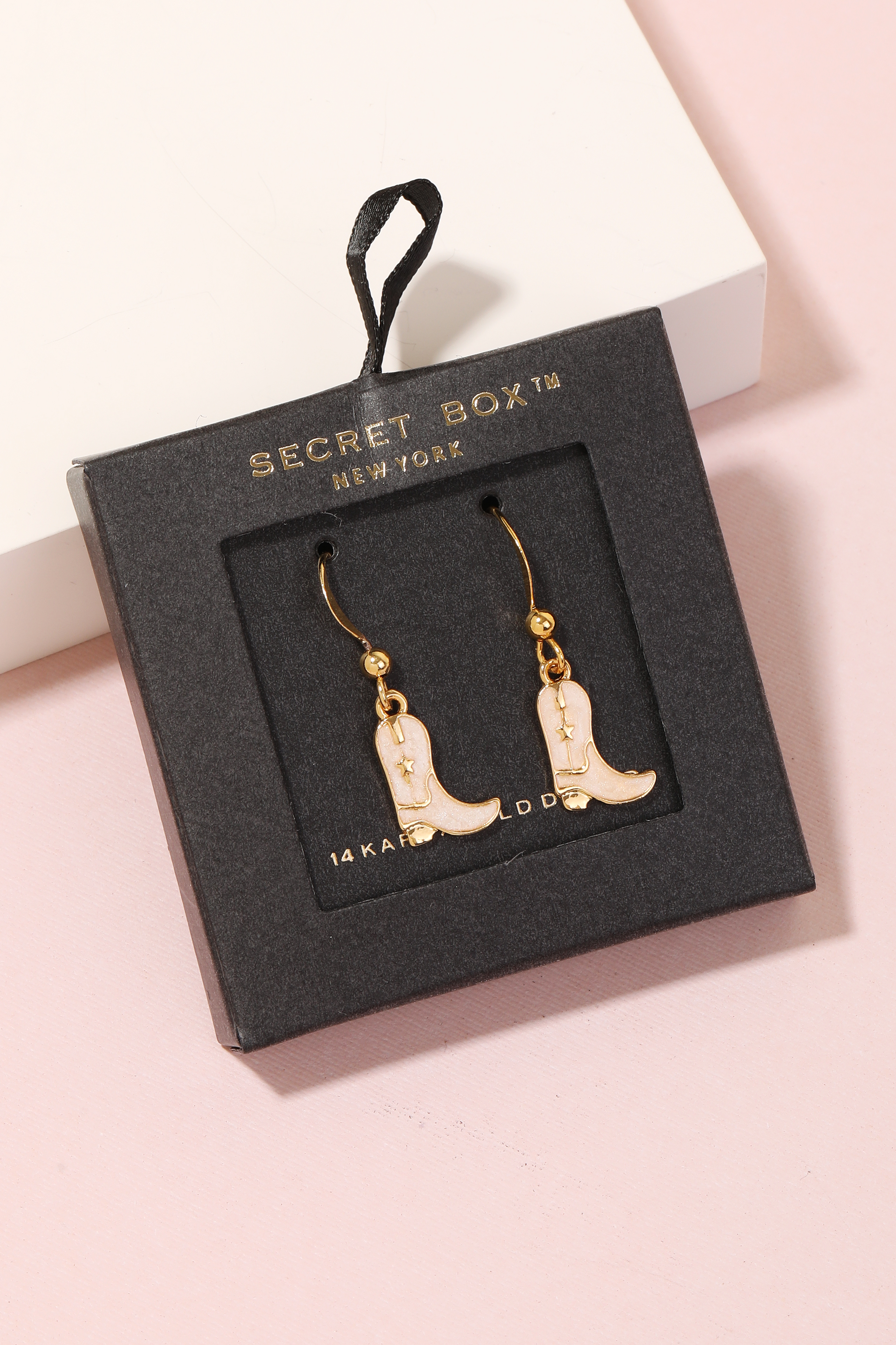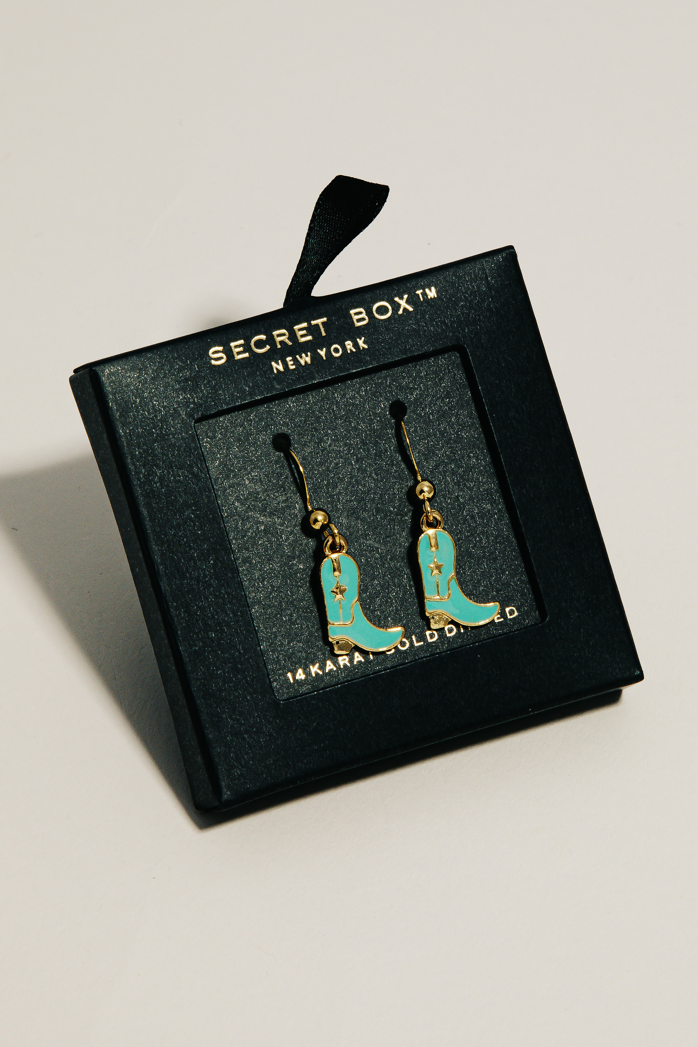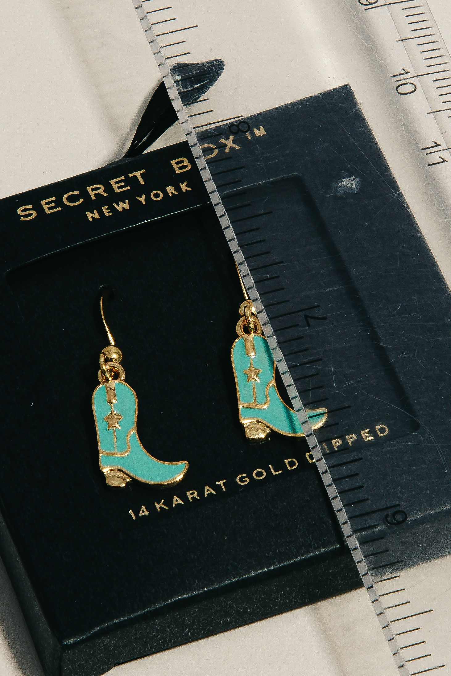 - A timeless piece that will never go out of style, this pair of gold dipped earrings comes with a special secret box cowboy boot earrings design. Perfect for any occasion, this versatile pair of gold dipped earrings will enhance any outfit you wear. Available in BK, TQ, WH. This item is sold in packs of 1.