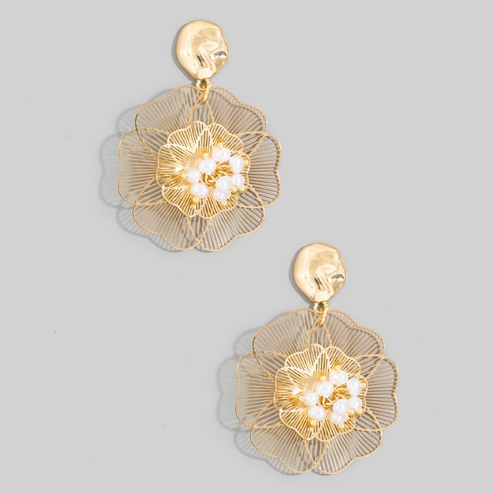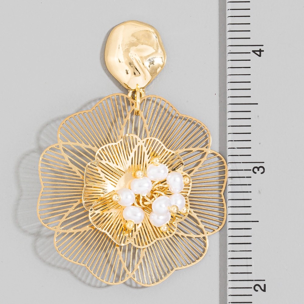 Effortlessly elevate your style, this pair of drop earrings flaunts a luxurious gold filigree flower pearl center design. Elevate your personal style effortlessly with this versatile pair of drop earrings, an essential component for a refined wardrobe. Available in GDCRM. This item is sold in packs of 1.