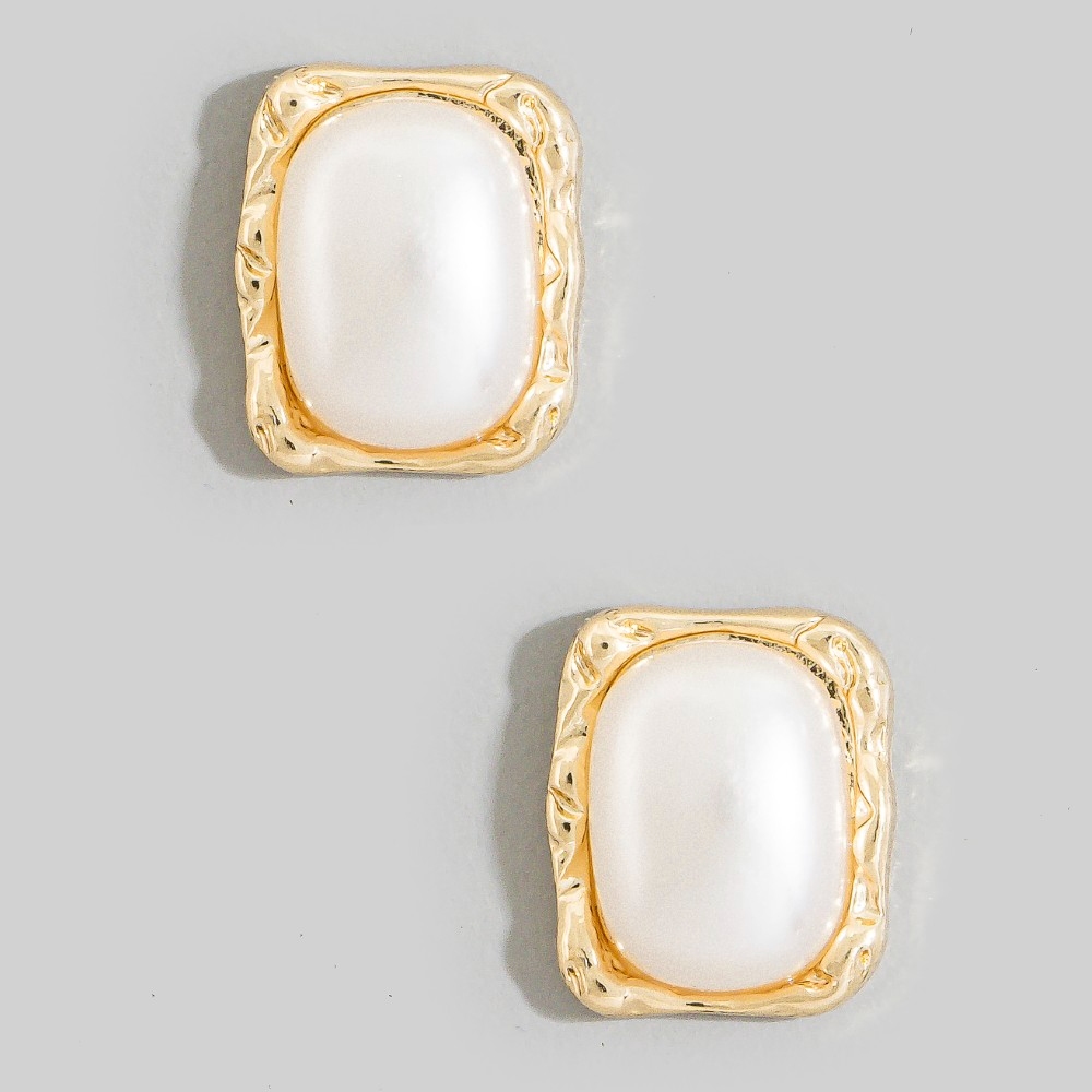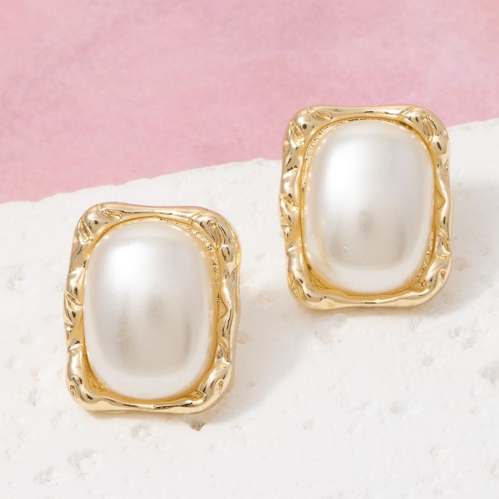 • Make a statement, this pair of stud earrings offers a remarkable gold molten frame pearl square design. This pair of stud earrings is the perfect way to add a touch of elegance to any outfit. Available in GDCM. This item is sold in packs of 1.