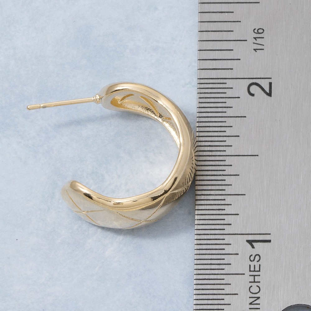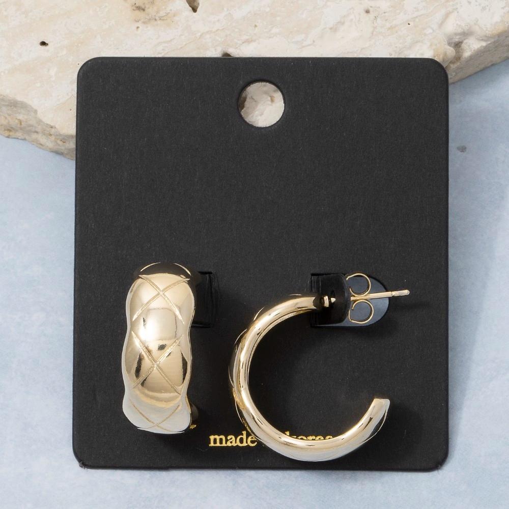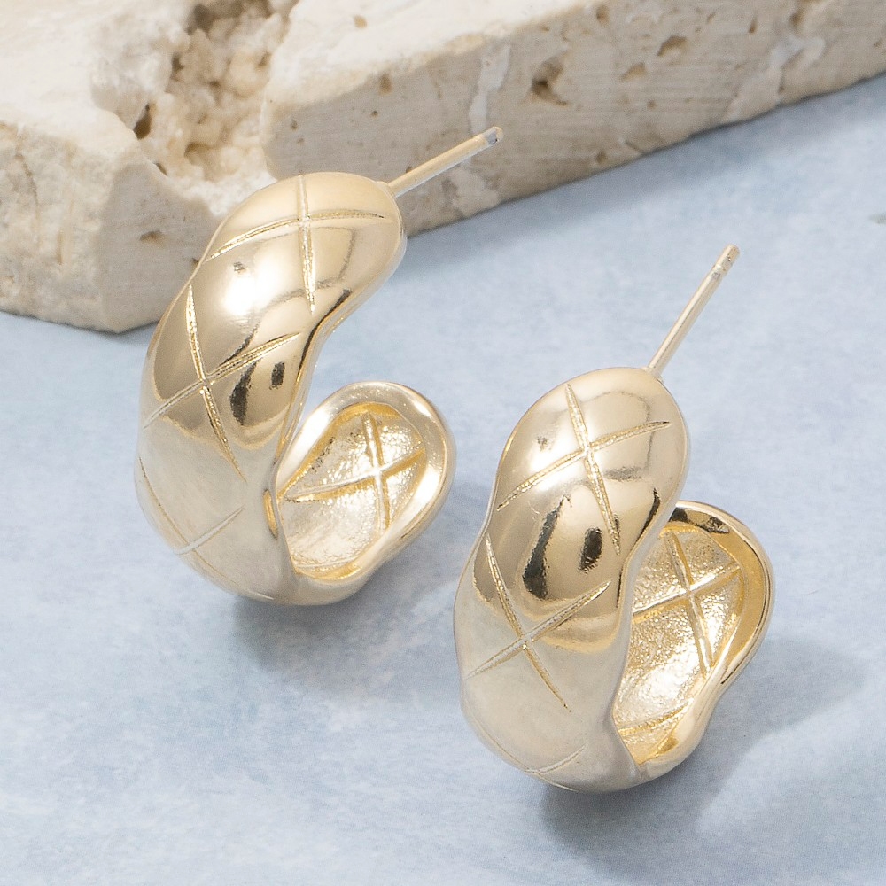 A bold and daring choice, perfect for those who want to stand out from the crowd, this pair of hoop earrings shows off a distinctive gold quilted wide design. Discover the magic of accessorizing with this versatile pair of hoop earrings, effortlessly upgrading the style quotient of any outfit. Available in G. This item is sold in packs of 1.
