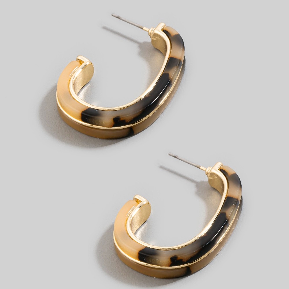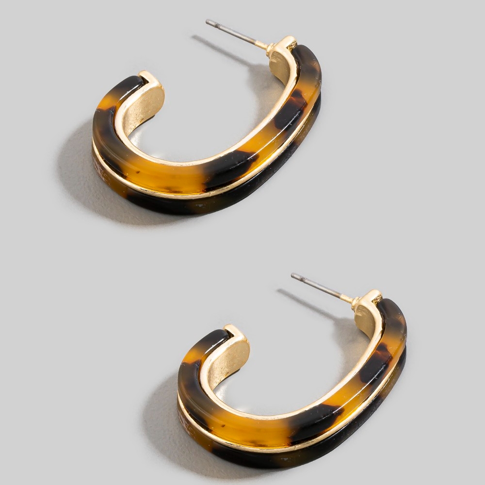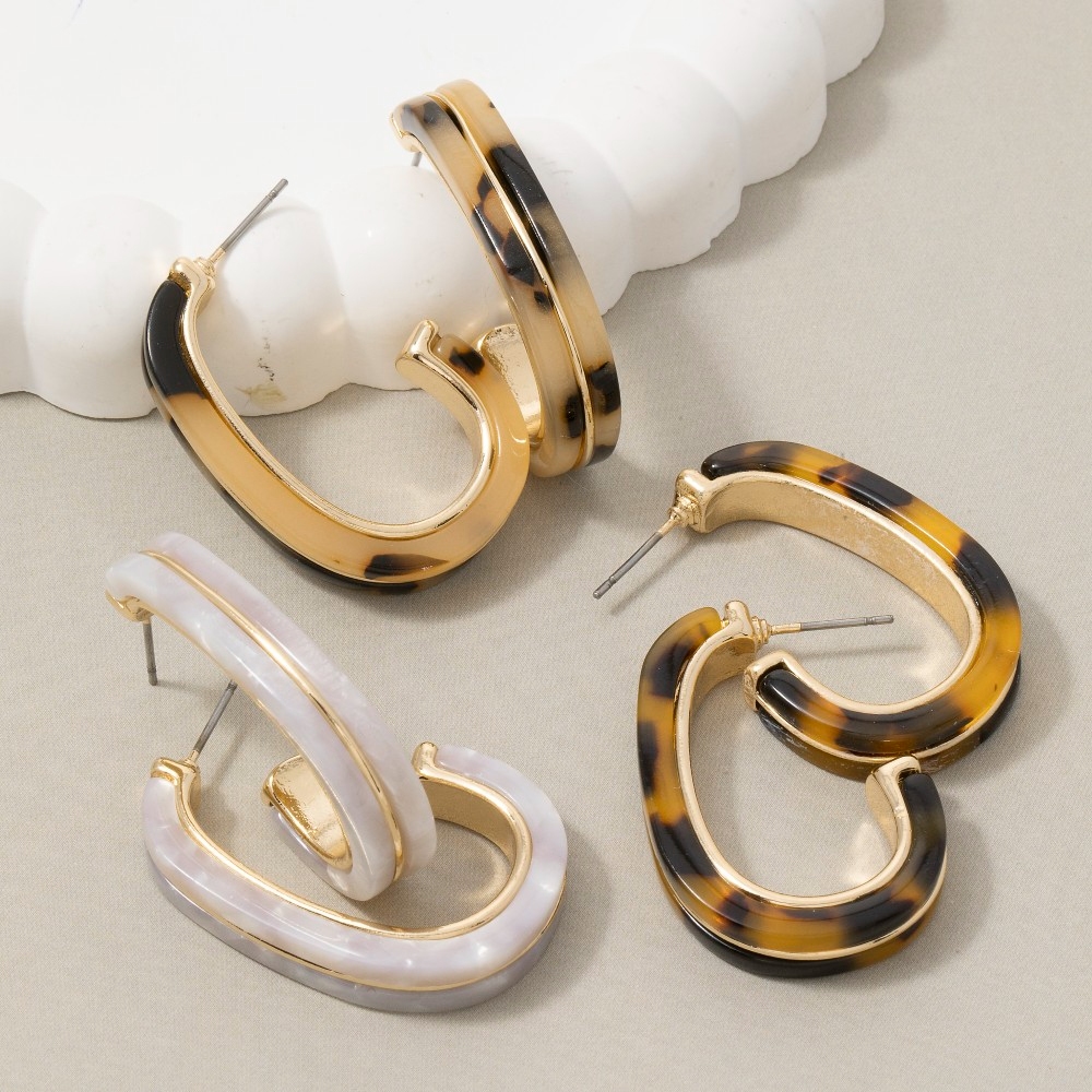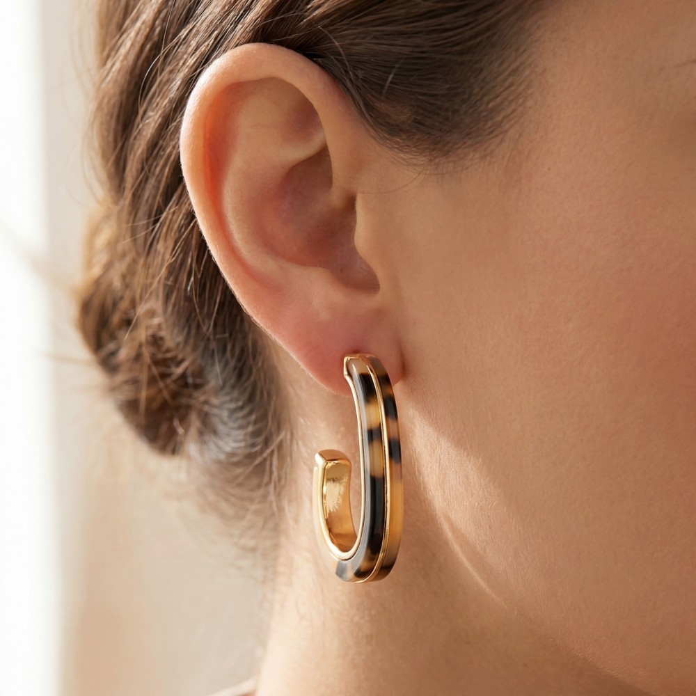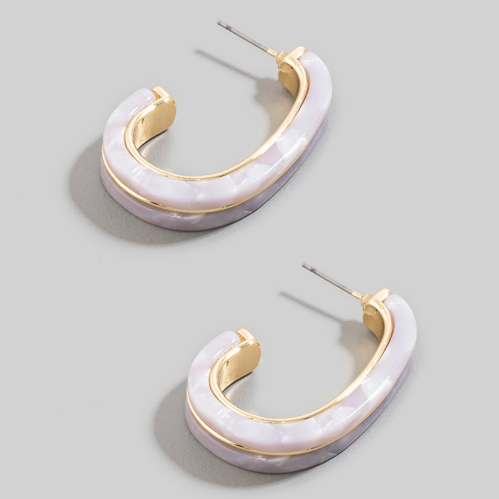 - Make a statement, this pair of hoop earrings evokes a captivating acetate and metallic oval design. Add some personality to your outfit with this stylish pair of hoop earrings. Available in DKTORT, LTTORT, WHT. This item is sold in packs of 1.