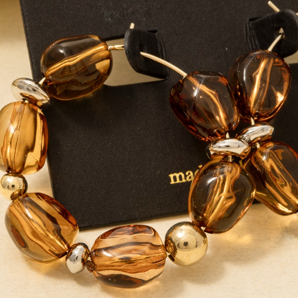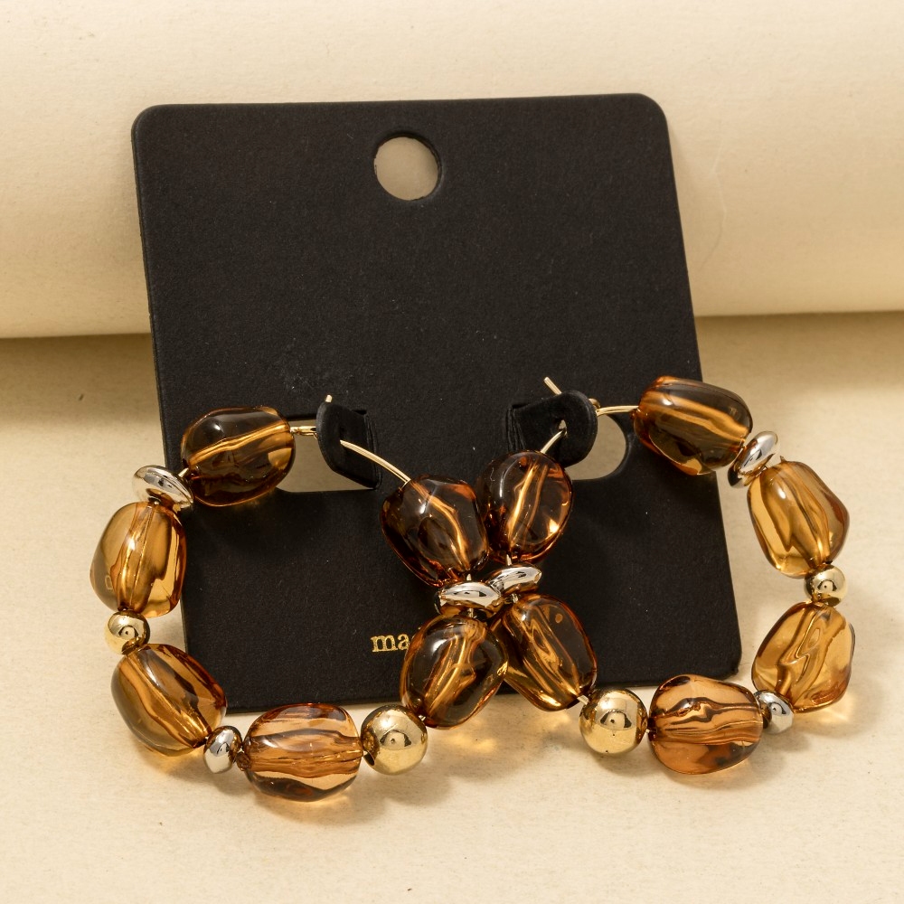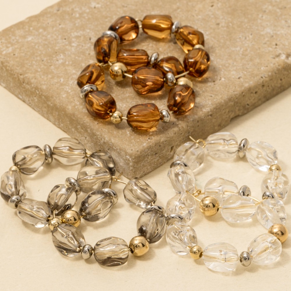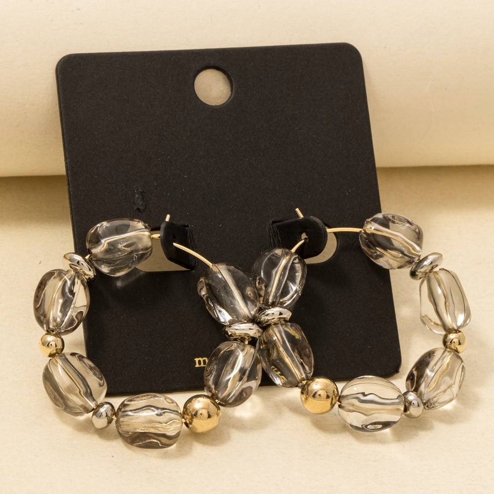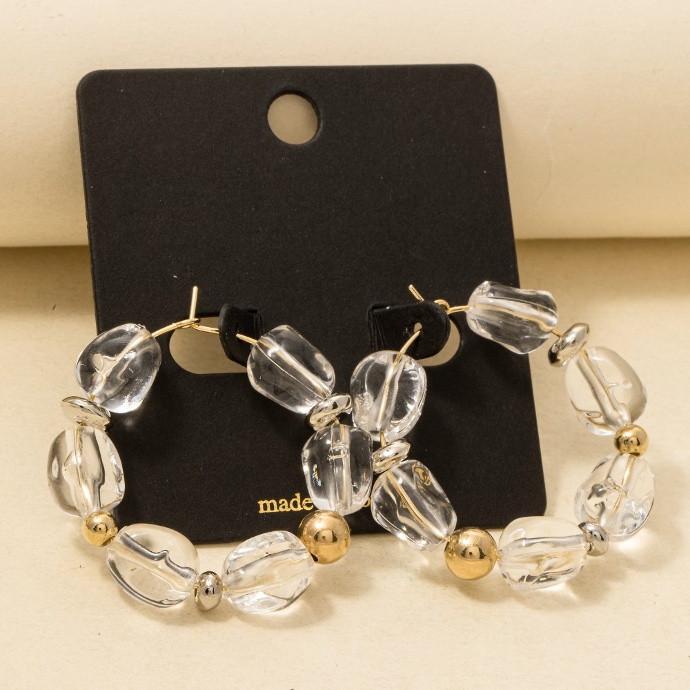 A contemporary masterpiece, this pair of hoop earrings emanates an elegant clear acrylic bead design. Elevate your personal style effortlessly with this versatile pair of hoop earrings, an essential component for a refined wardrobe. Available in BR, CL, GR. This item is sold in packs of 1.
