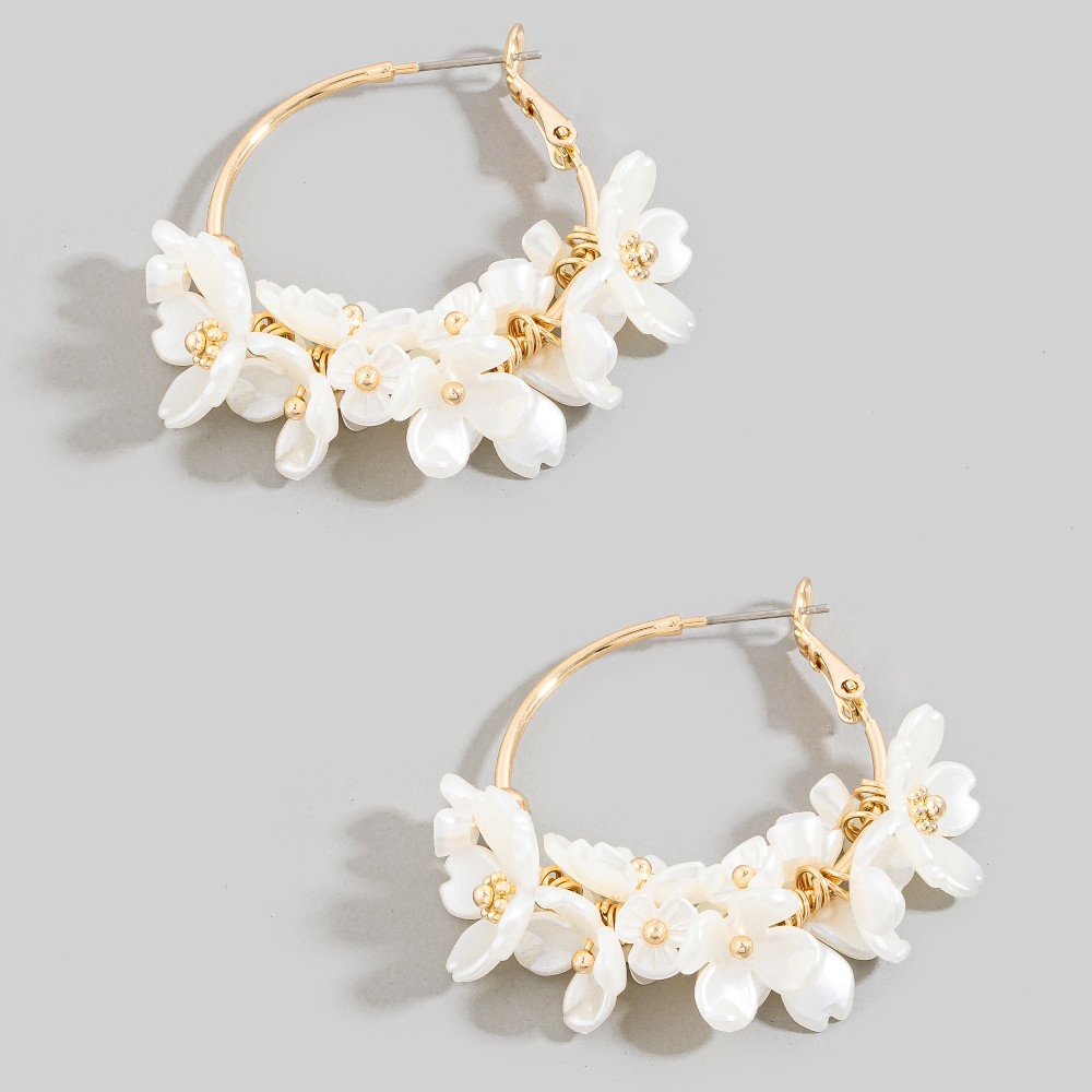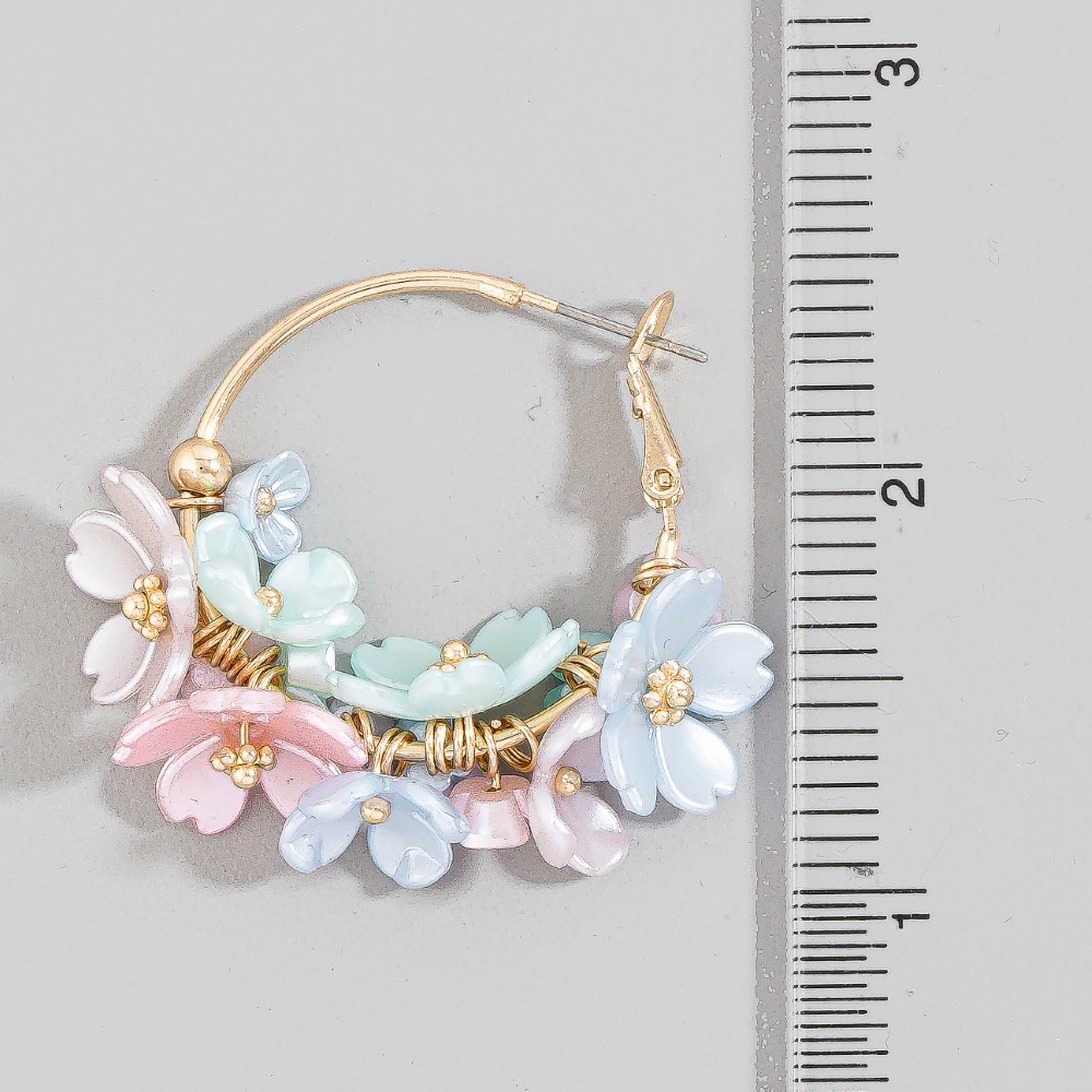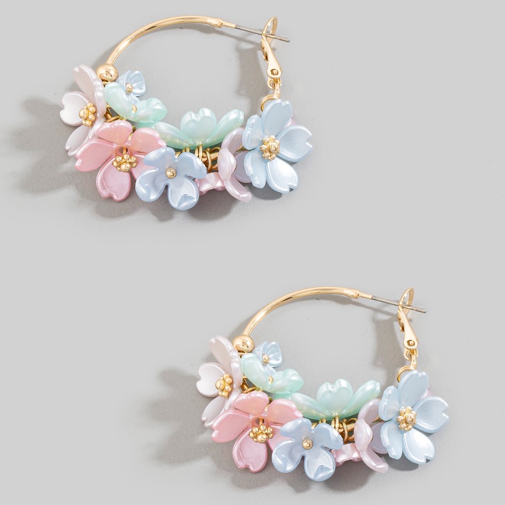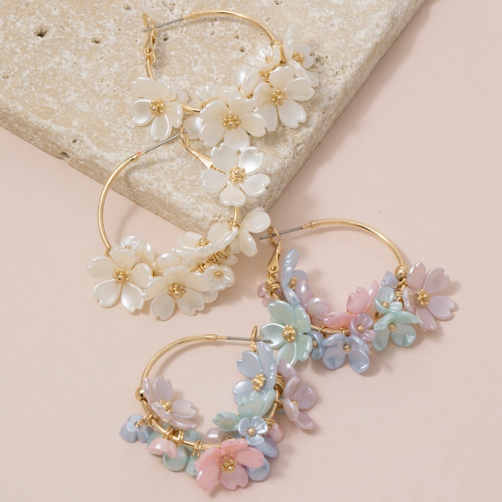 • The perfect way to add some sparkle to your outfit, this pair of hoop earrings emanates an elegant colorful acrylic cluster flowers design. This item is the perfect way to add some texture and interest to any outfit. Available in LMUL, WHT. This item is sold in packs of 1.