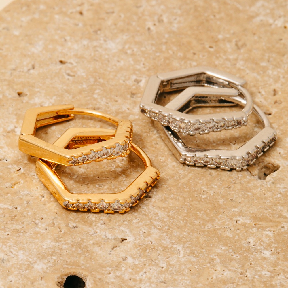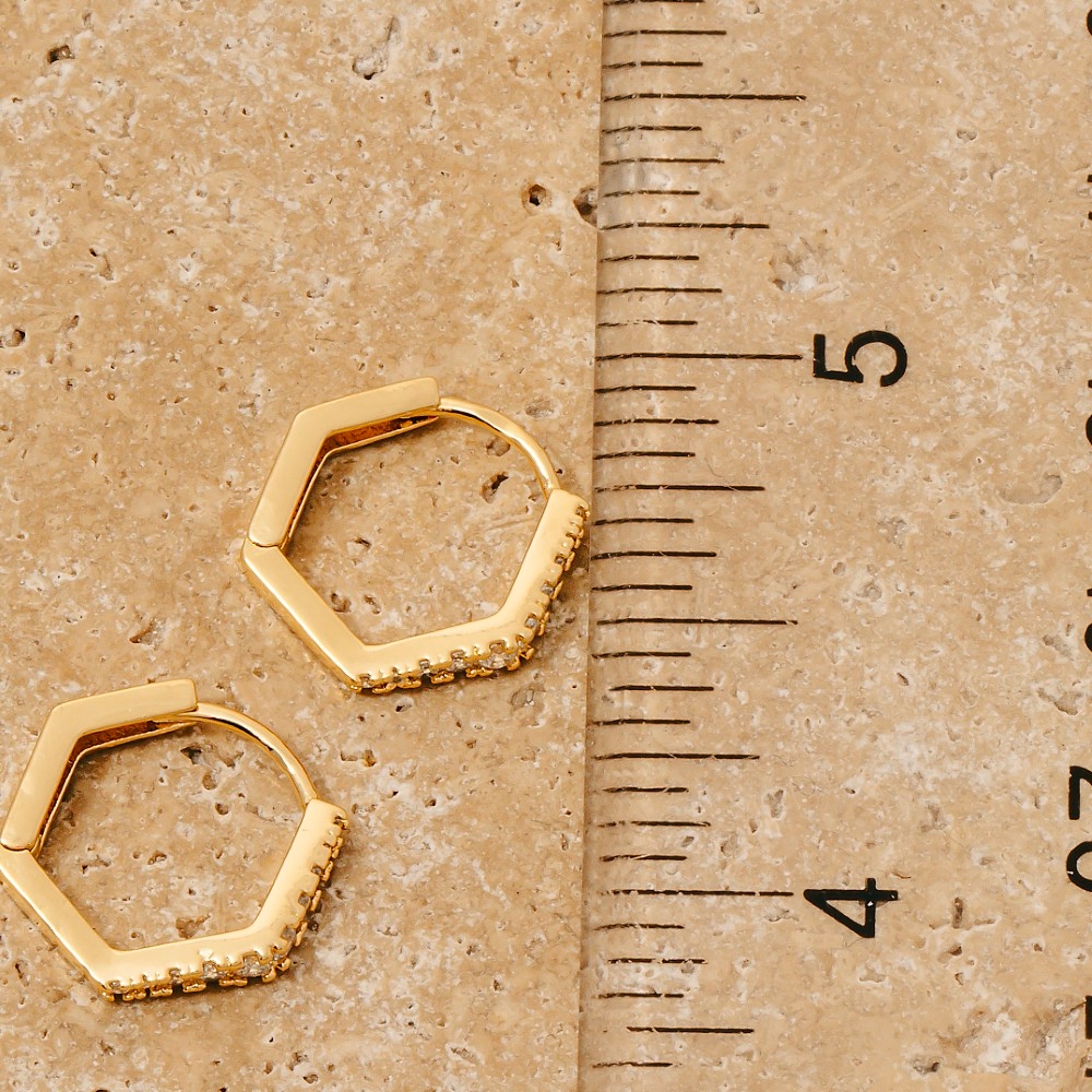 - The perfect way to add some edge to your look, this pair of hoop earrings emanates an elegant cz pave hexagon design. This item is the perfect finishing touch to any outfit, adding a touch of glamour and sophistication. Available in G, S. This item is sold in packs of 1.