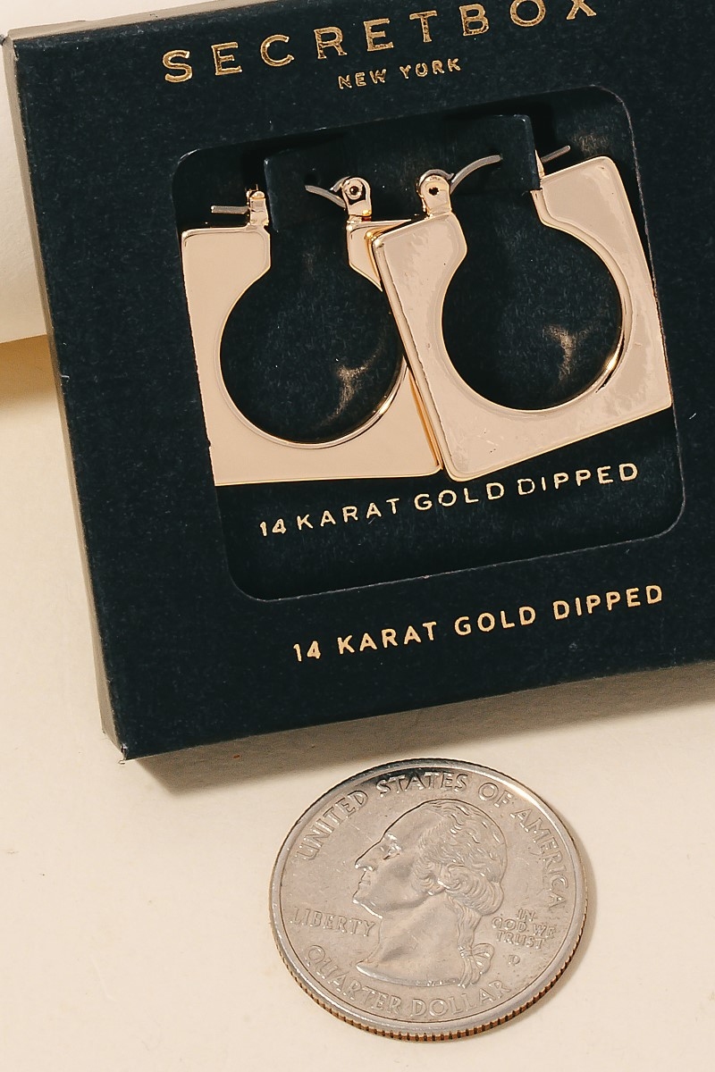 • This pair of hoop earrings showcases a unique gold dipped circle cut out square style. Experience a subtle blend of modernity and classic charm as this pair of hoop earrings effortlessly adorns your ensemble.