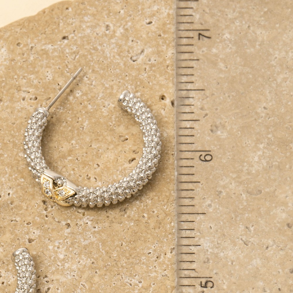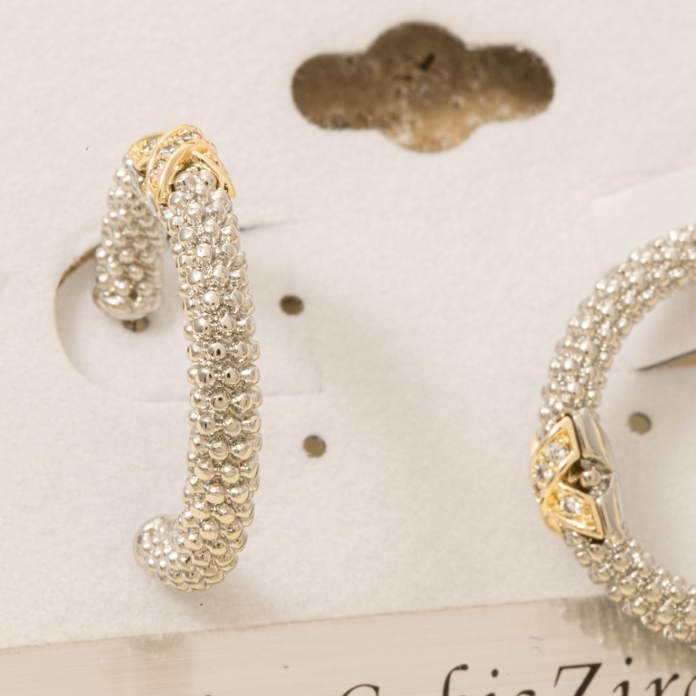 Perfect for any fashion-forward individual, this pair of hoop earrings possesses a fine gold plated cubic zirconia two tone textured design. Perfect for dressing up or down, this versatile pair of hoop earrings adds a touch of sophistication to any look. Available in T. This item is sold in packs of 1.