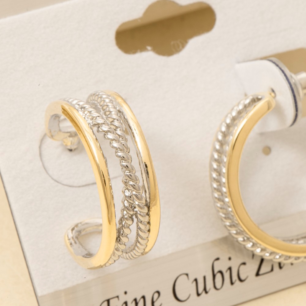 Stay on-trend and ahead of the fashion curve, this pair of hoop earrings showcases a breathtaking gold plated two tone layered design. The perfect pair of hoop earrings for completing any outfit, whether you're dressing up or keeping it casual. Available in T. This item is sold in packs of 1.
