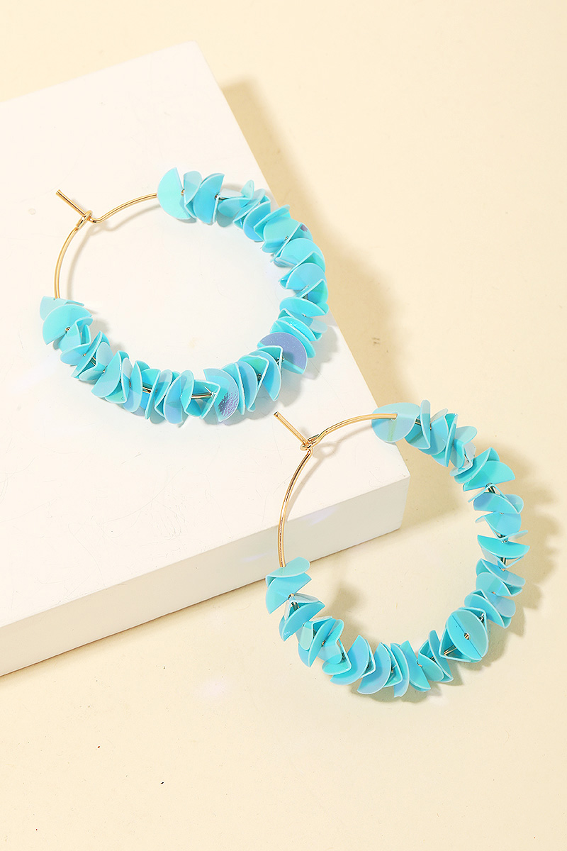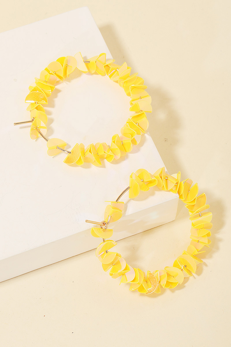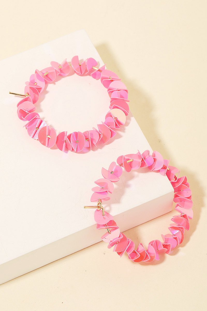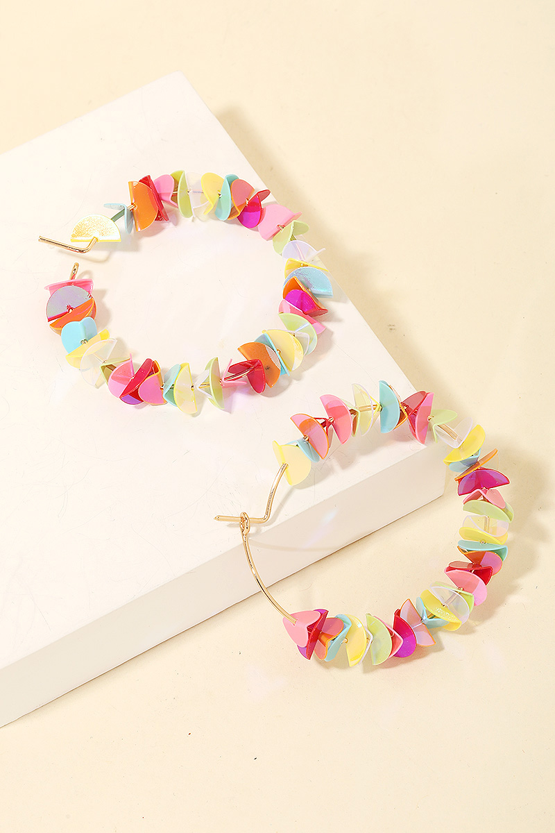 • Perfectly versatile and endlessly stylish, this pair of hoop earrings contains a special layered sequin hoop earrings design. This item is perfect for adding some color and vibrancy to any outfit. Available in AB, LBU, MLT, PNK and YEL. This item is sold in packs of 1.