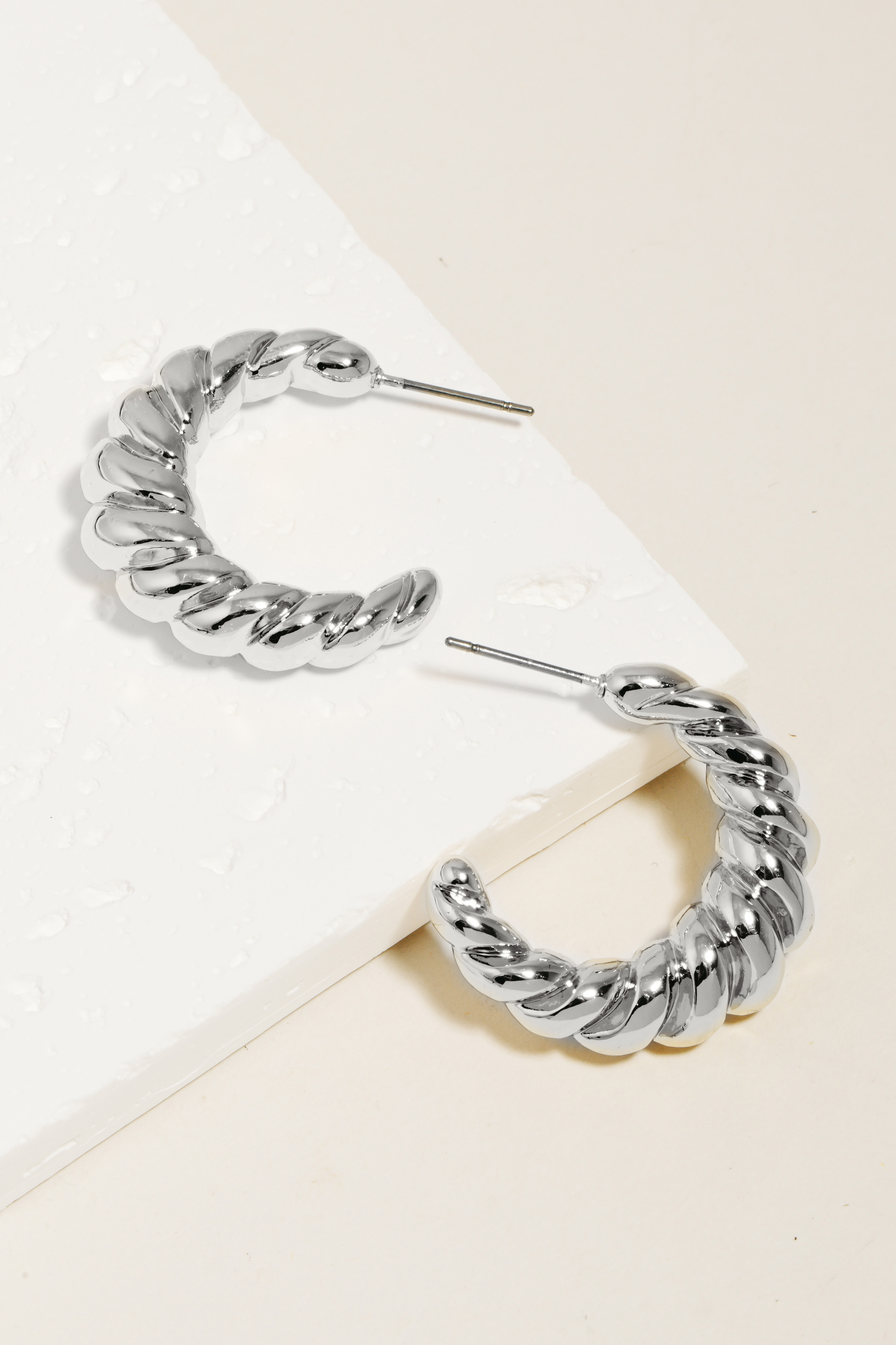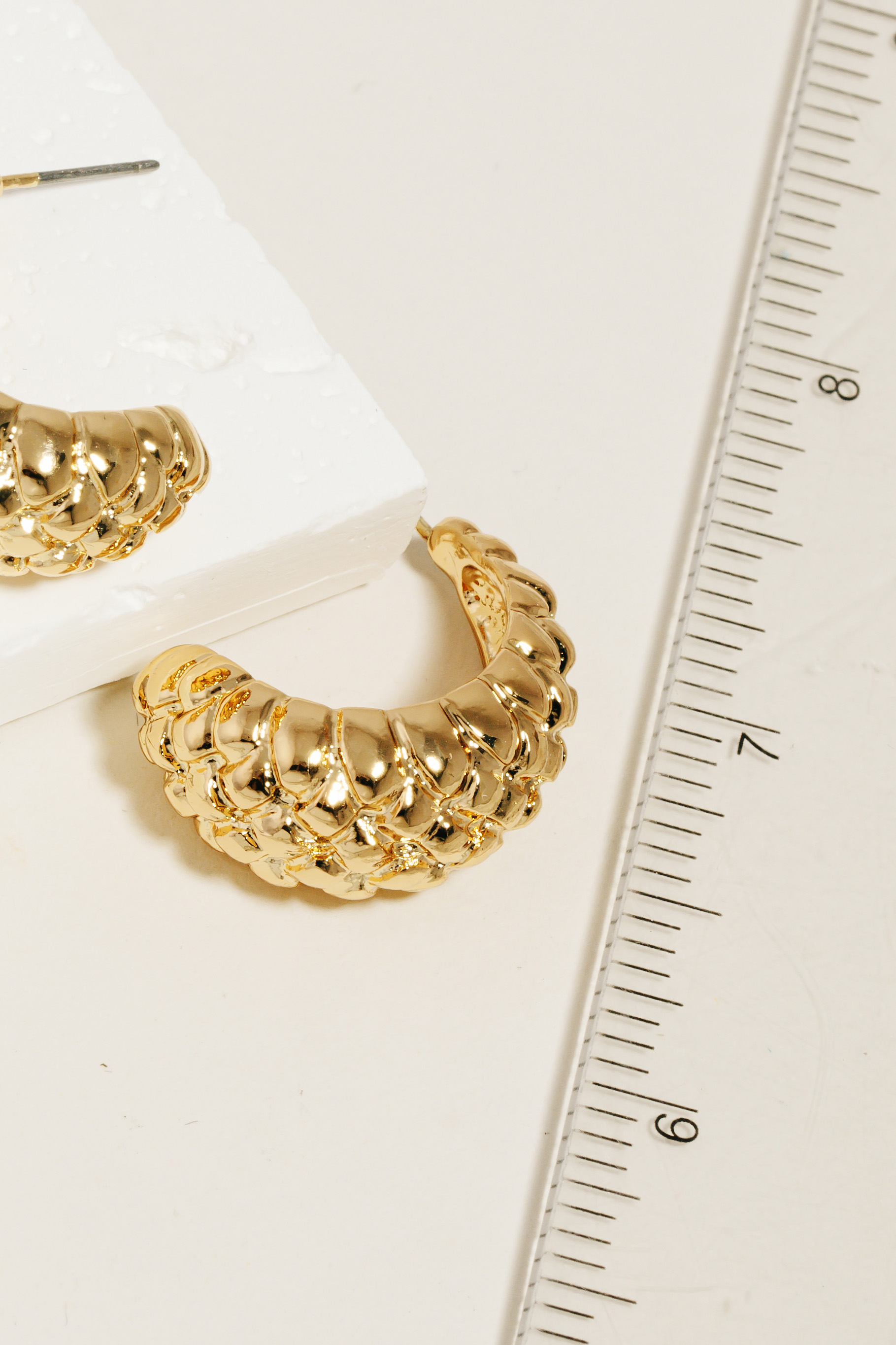 • This piece is both elegant and versatile, this pair of hoop earrings reveals an intricate metallic textured c design. A must-have accessory that adds a unique flair to any look. Available in G and S. This item is sold in packs of 1.