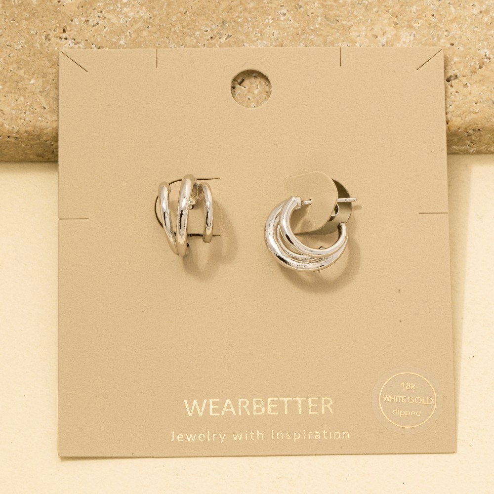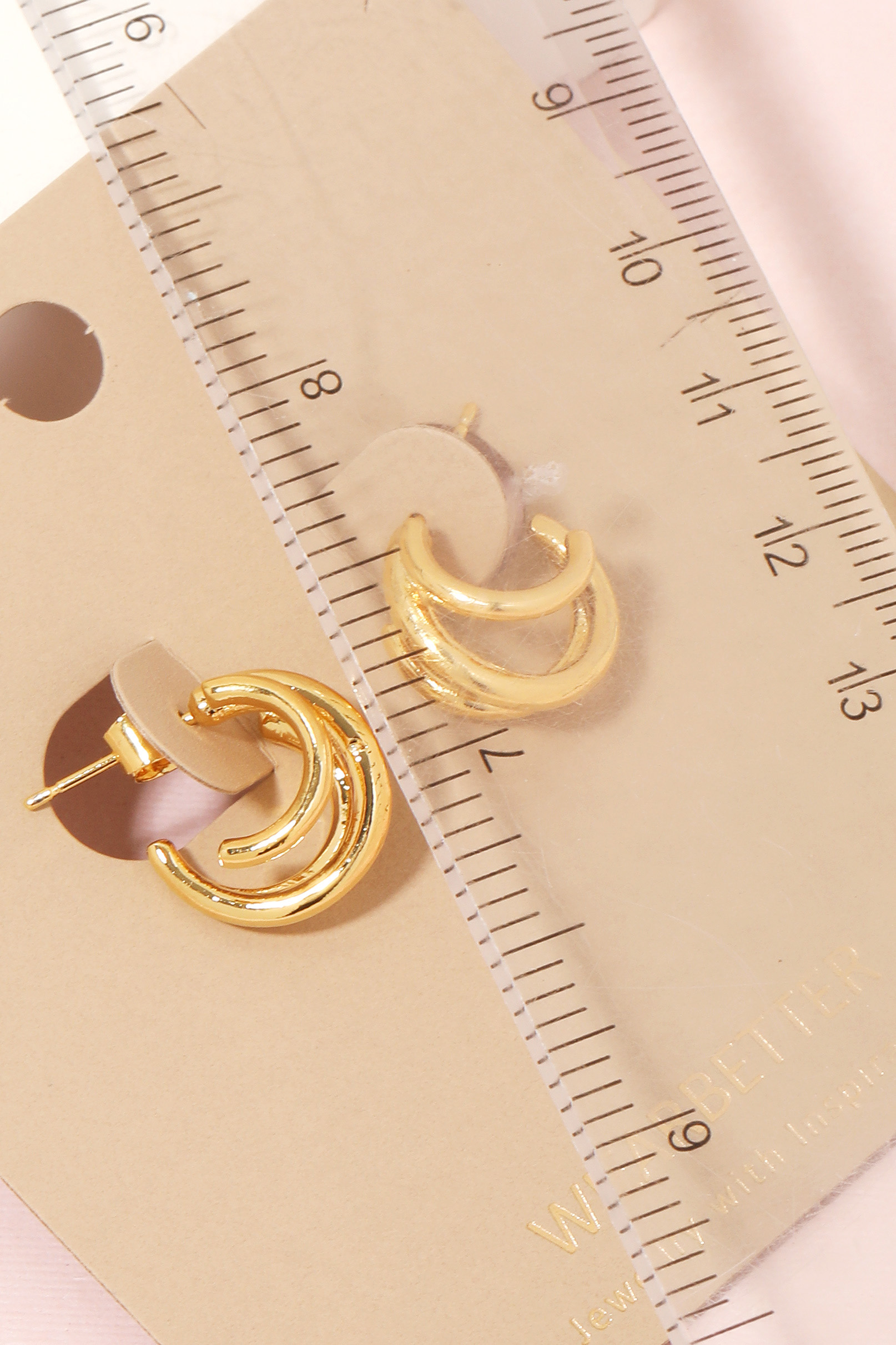 Stay on-trend and ahead of the fashion curve, this pair of hoop earrings flaunts a luxurious mini three layered design. Elevate your style effortlessly with this versatile pair of hoop earrings, enhancing the appeal of any ensemble. Available in G. This item is sold in packs of 1.
