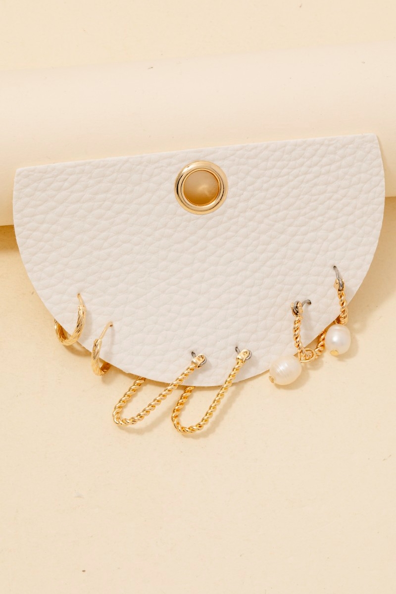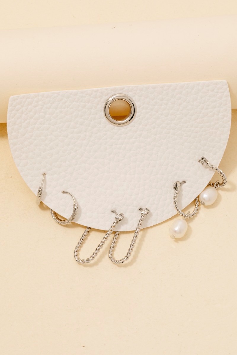 • This pair of hoop earrings features a fashionable pearl charm 3pc twisted set style. Witness the transformative power of accessories as this piece effortlessly redefines your fashion narrative.