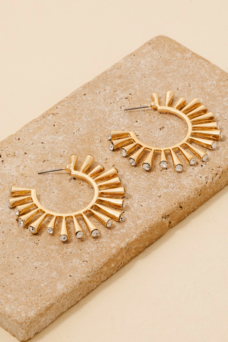 • Perfectly versatile and endlessly stylish, this pair of hoop earrings incorporates a remarkable rhinestone studded sunshine design. A must-have pair of hoop earrings that effortlessly enhances your style, no matter the occasion. Available in GD. This item is sold in packs of 1.