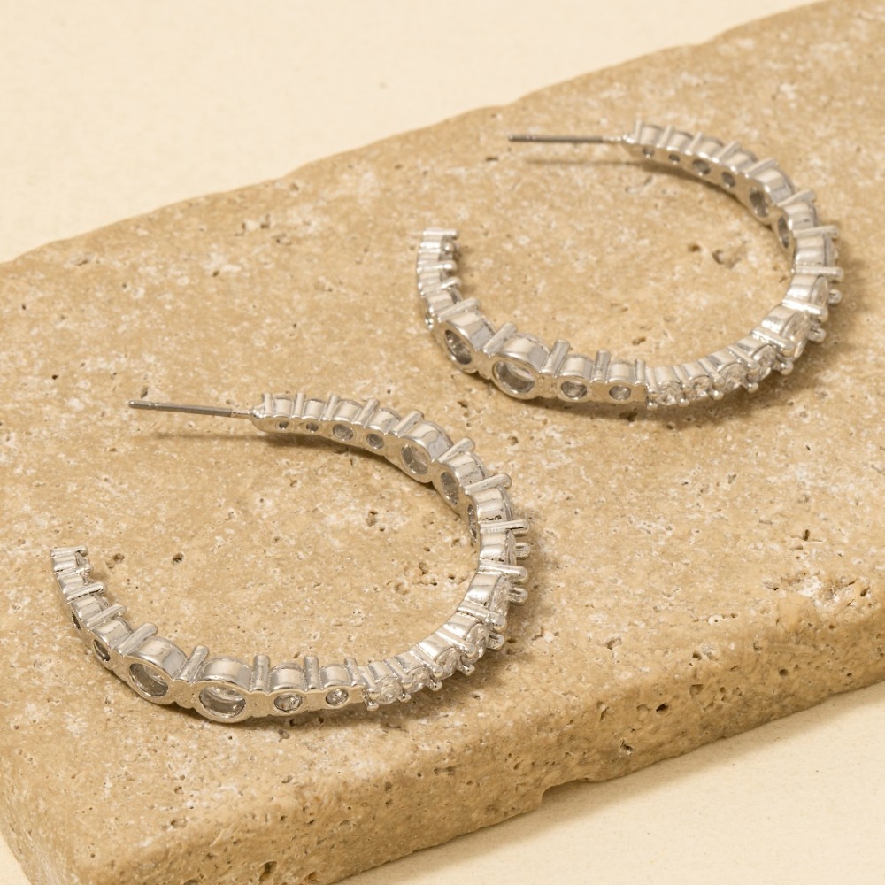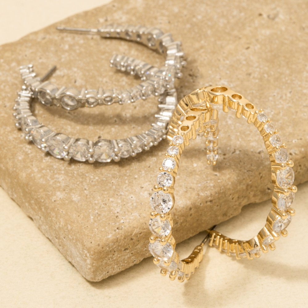 • Effortlessly elevate your outfit, this pair of hoop earrings carries a charming round cut rhinestones tennis design. The perfect way to complete any outfit, whether you're dressing up or keeping it casual. Available in CLG2, CLR2. This item is sold in packs of 1.
