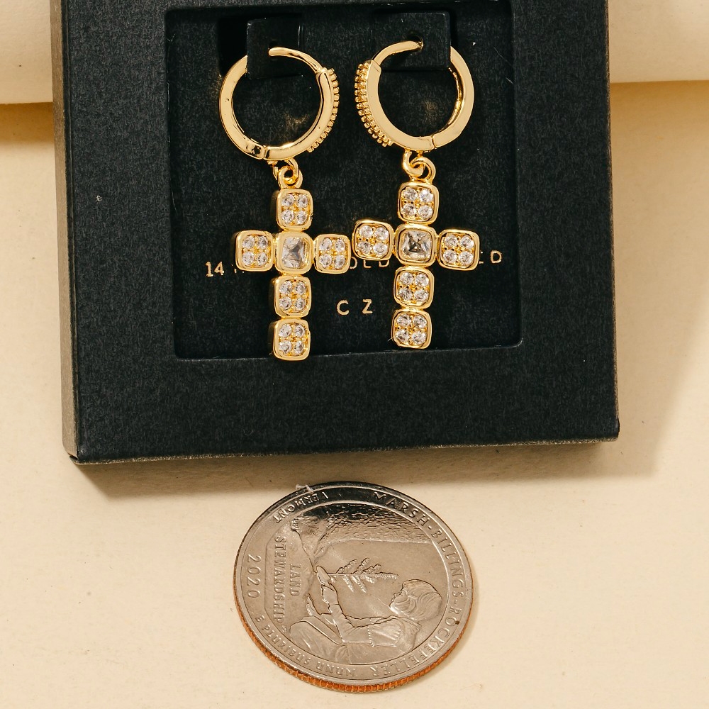 This piece is perfect for those who want to showcase their unique style, this pair of hoop earrings showcases a breathtaking secret box gold dipped cubic zirconia cross charm design. This item is perfect for adding some color and vibrancy to any outfit. Available in GD, WG. This item is sold in packs of 1.