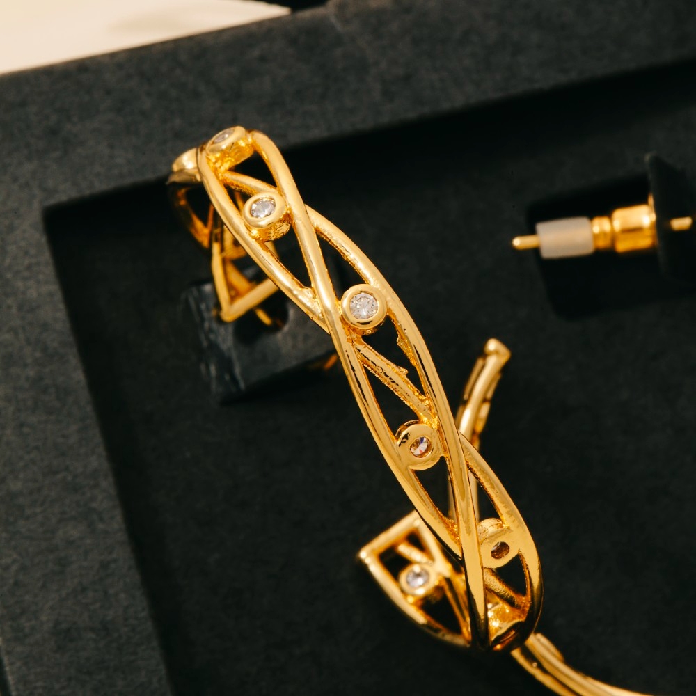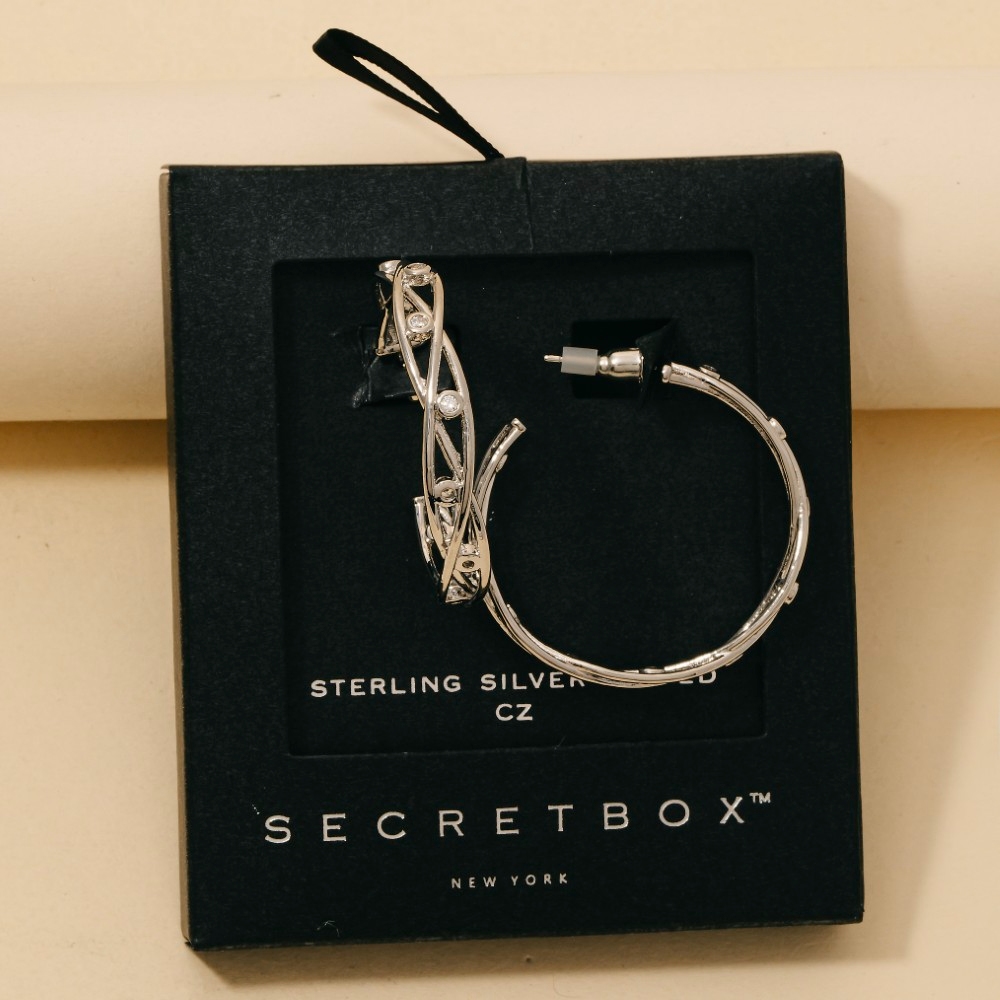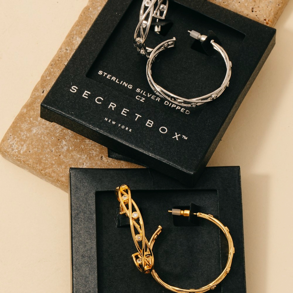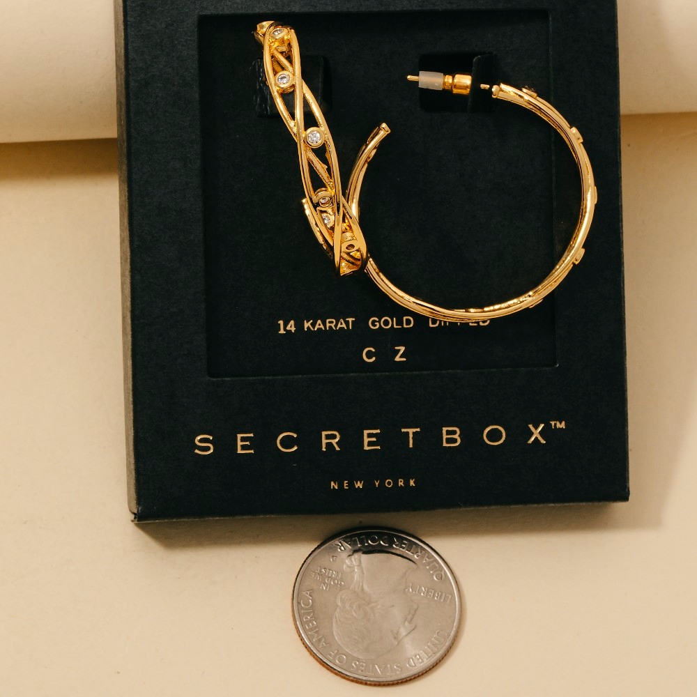 • The perfect way to add some edge to your look, this pair of hoop earrings features a distinct secret box gold dipped cubic zirconia station woven wire design. A perfect addition to your wardrobe that effortlessly enhances your style. Available in GD, WG. This item is sold in packs of 1.