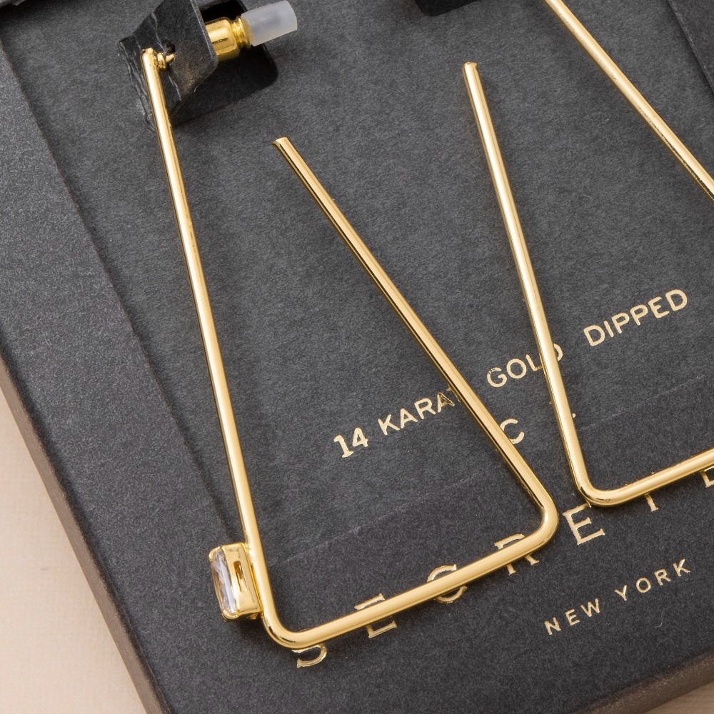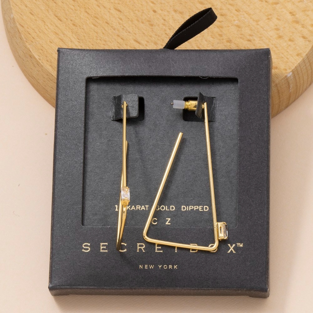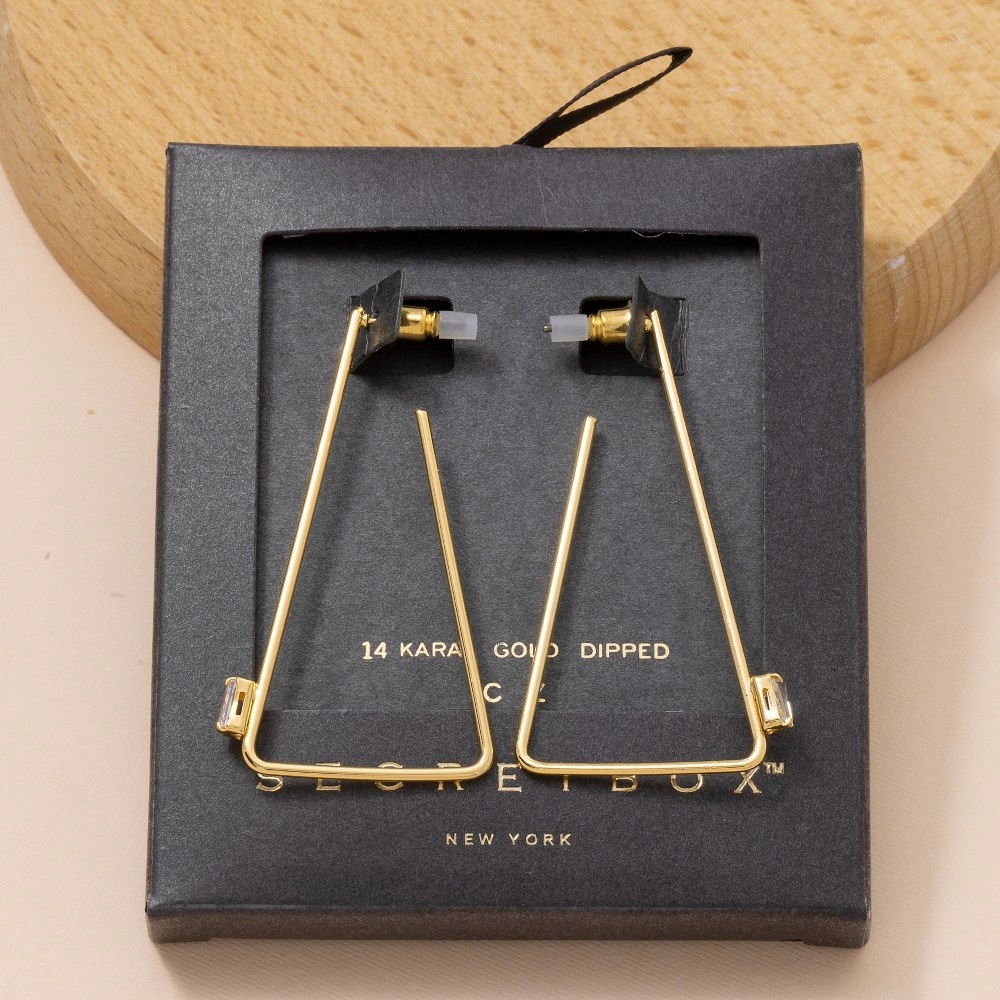 • This piece is both timeless and on-trend, this pair of hoop earrings showcases an alluring secret box gold dipped triangle design. Embrace fashion flexibility with this versatile pair of hoop earrings, designed to effortlessly enhance the sophistication of any outfit. Available in GD, WG. This item is sold in packs of 1.