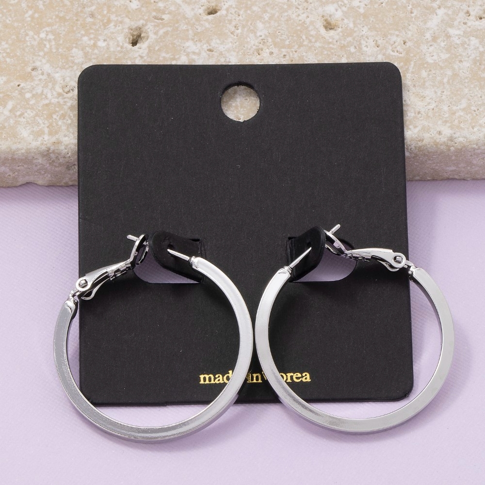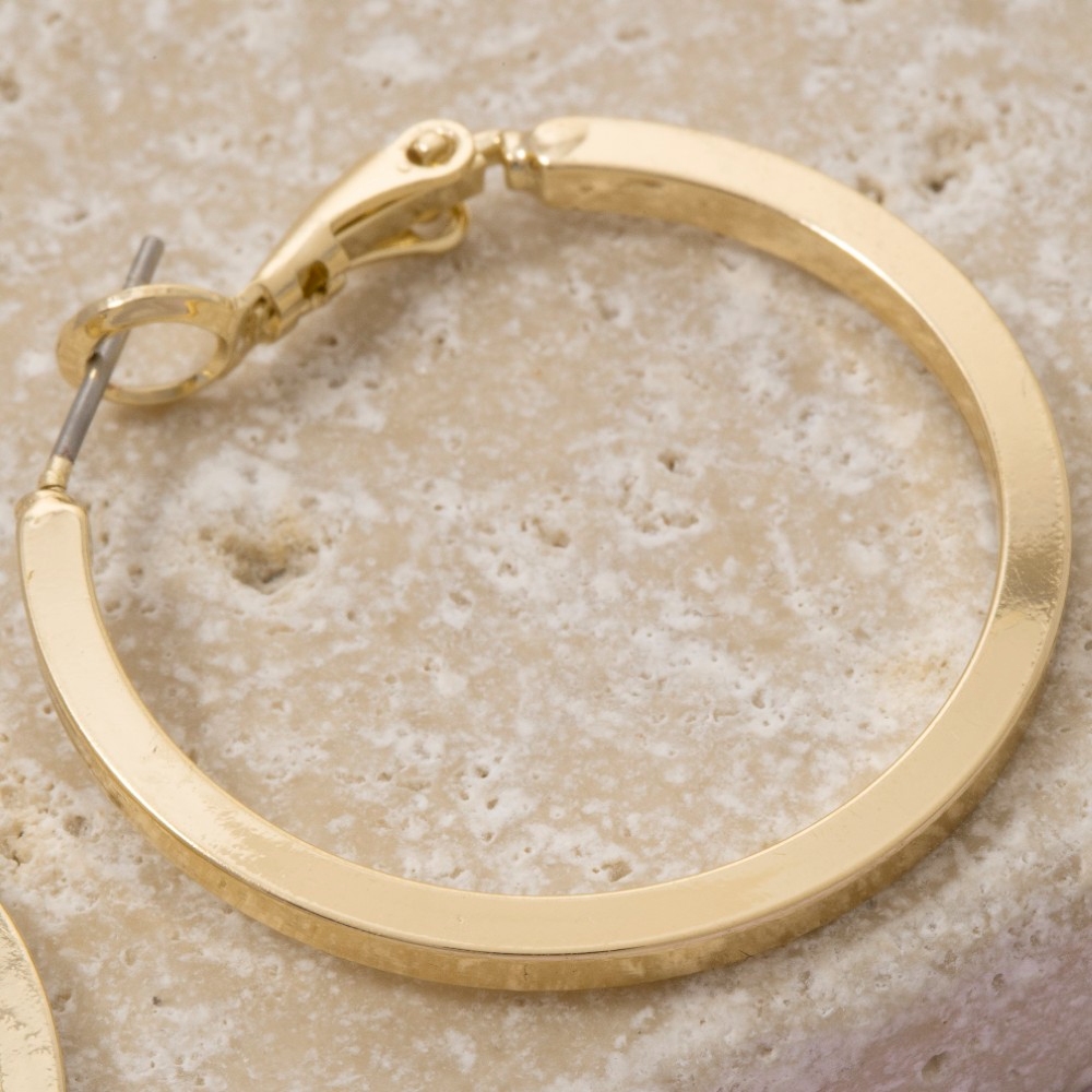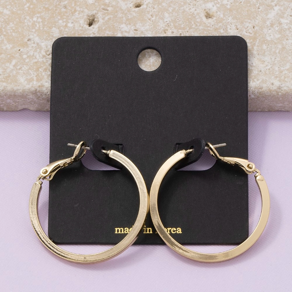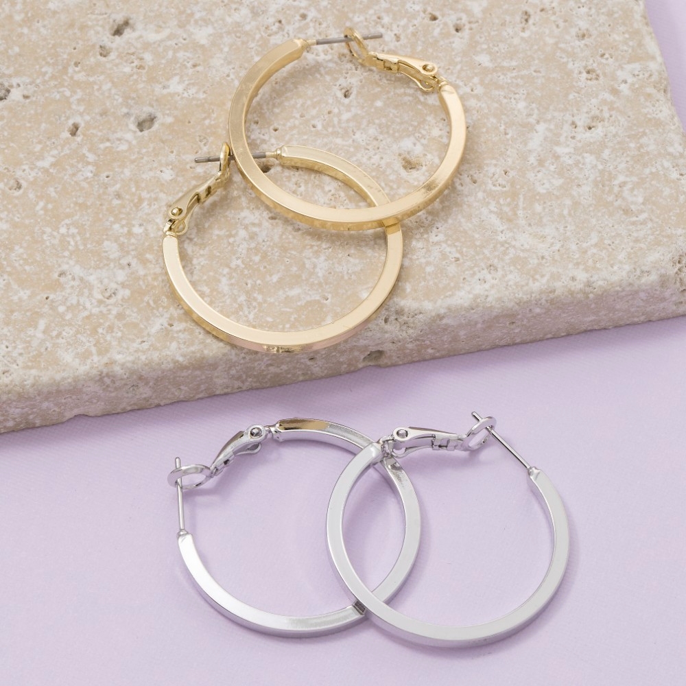 Sleek and modern, this pair of hoop earrings radiates a sleek simple flat sided latch design. Perfect for dressing up your favorite outfit, this pair of hoop earrings is a must-have. Available in G, S. This item is sold in packs of 1.