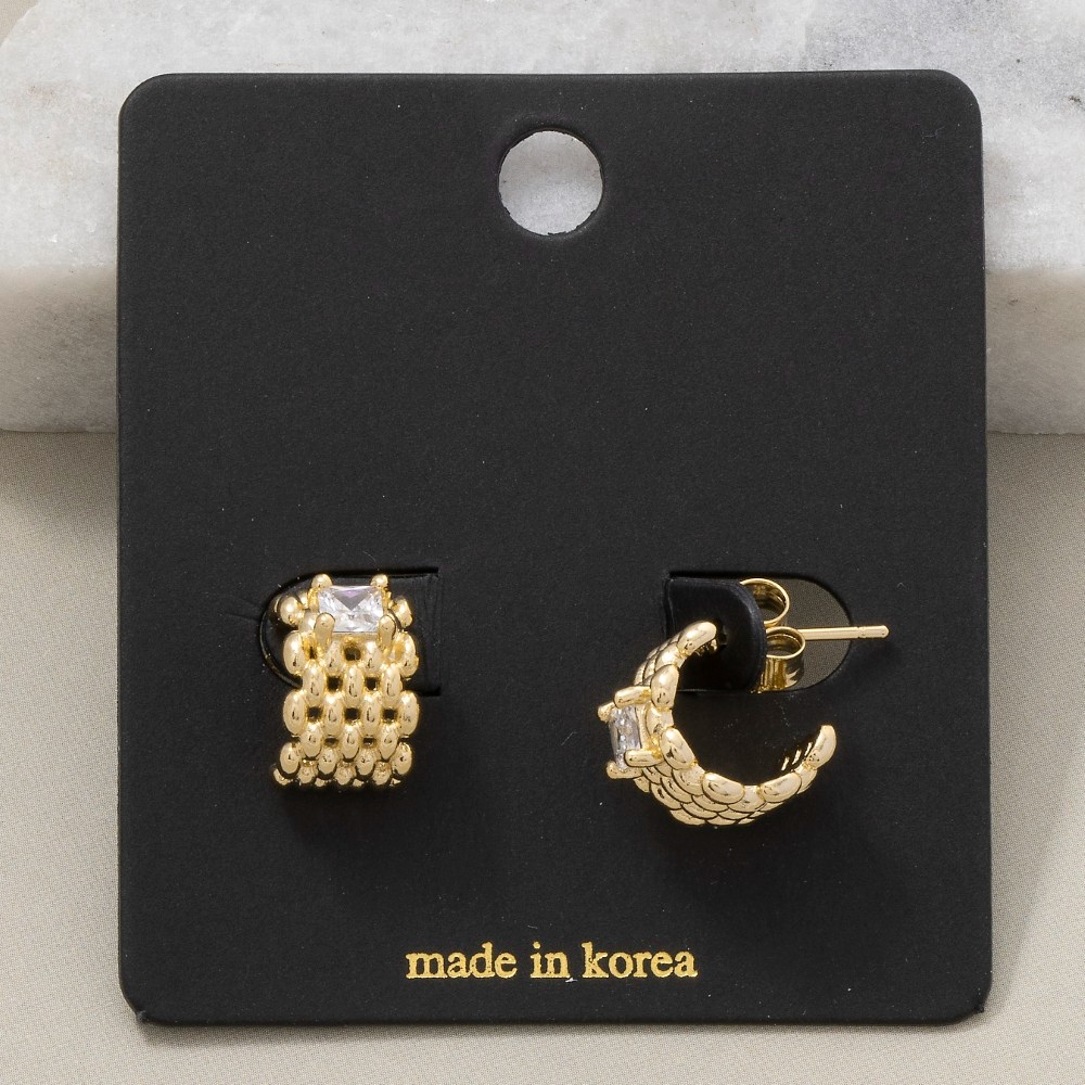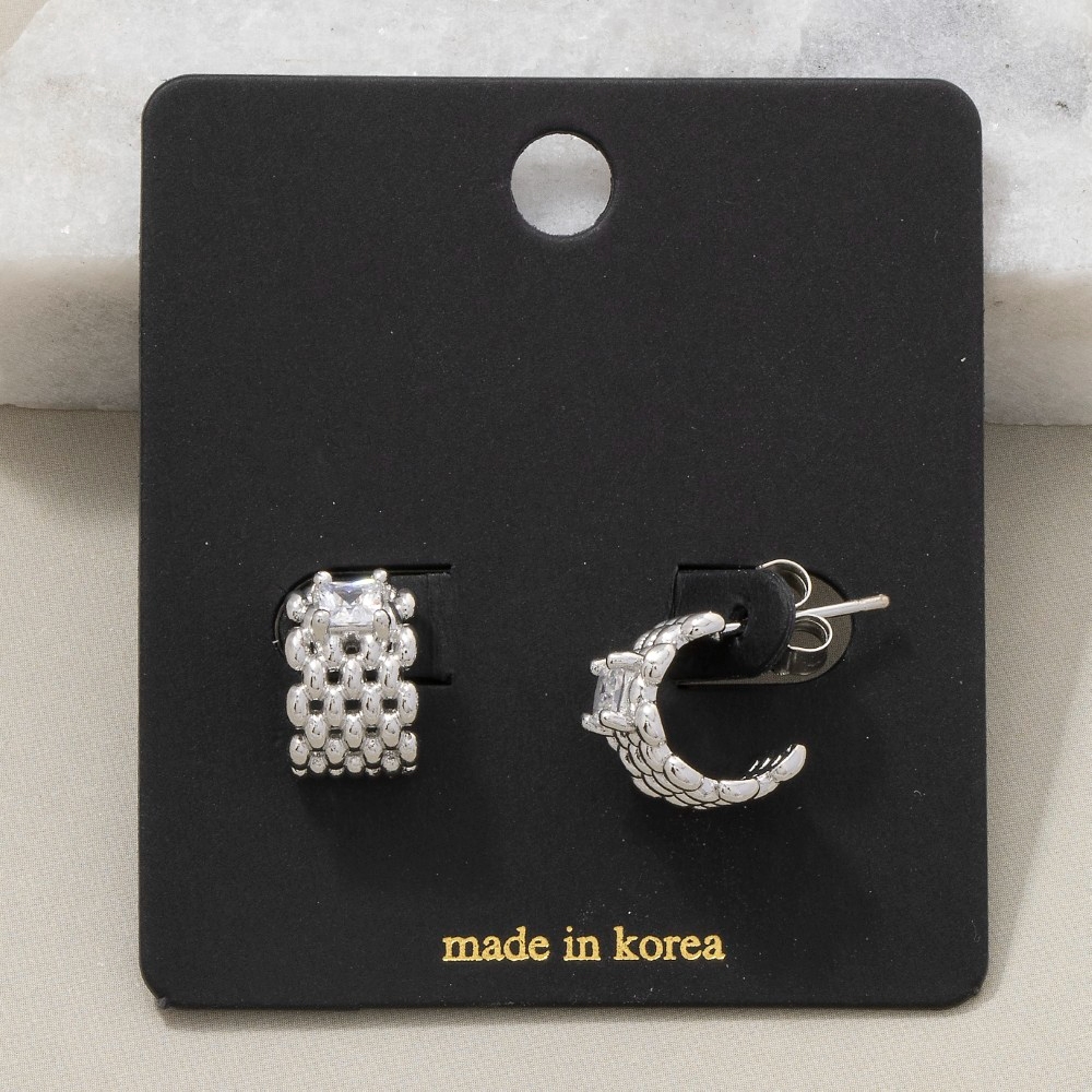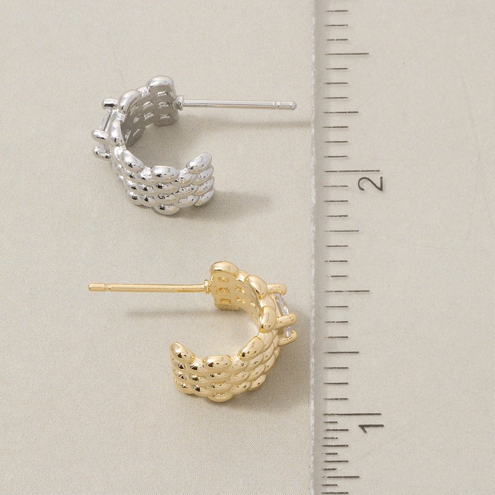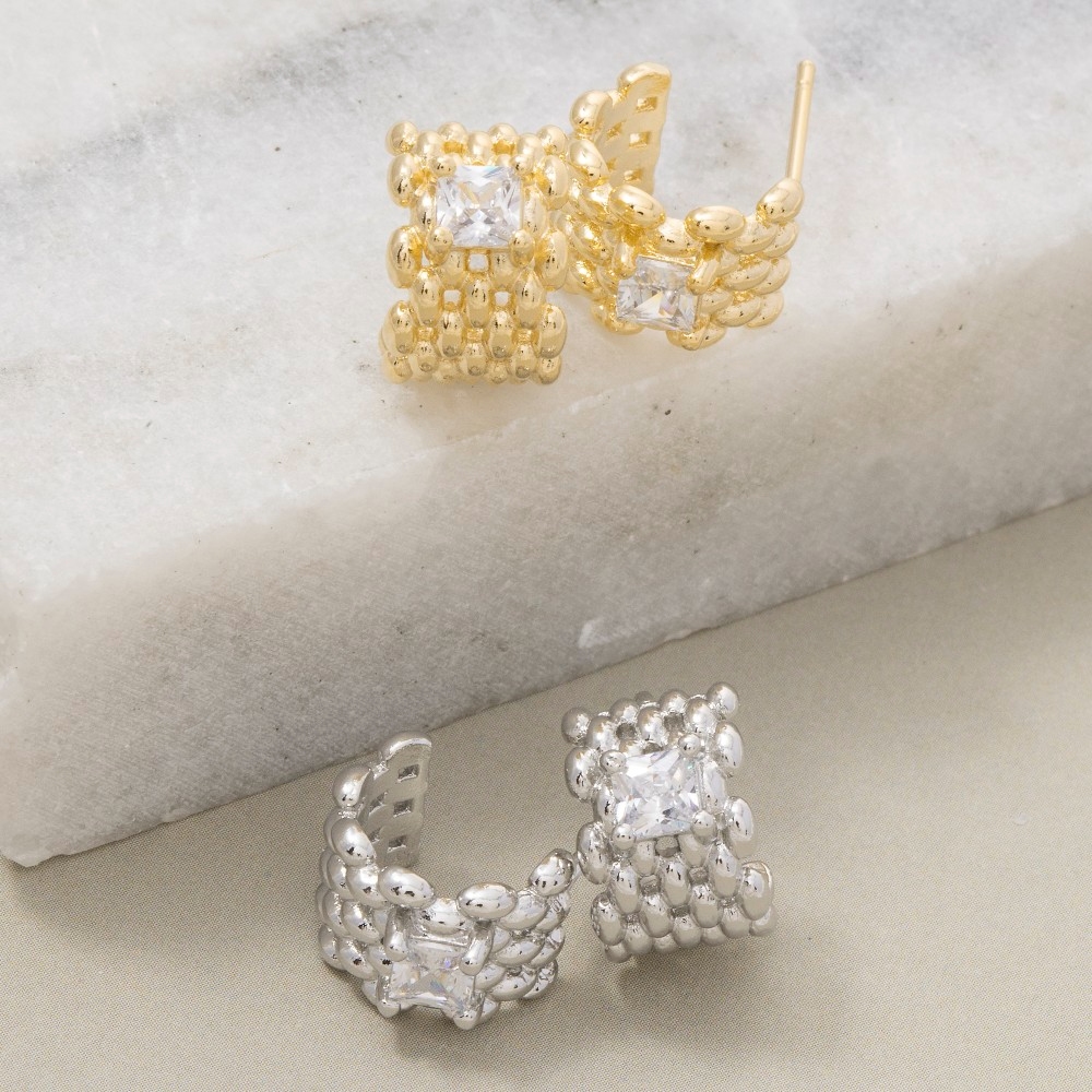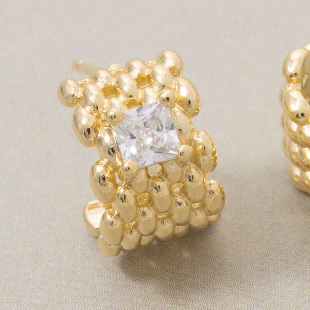 - The perfect way to showcase your unique style, this pair of hoop earrings adds a distinctive square cubic zirconia wide solid mesh design. Add a dash of sophistication to your look with this versatile pair of hoop earrings, a must-have for fashion enthusiasts. Available in G, S. This item is sold in packs of 1.