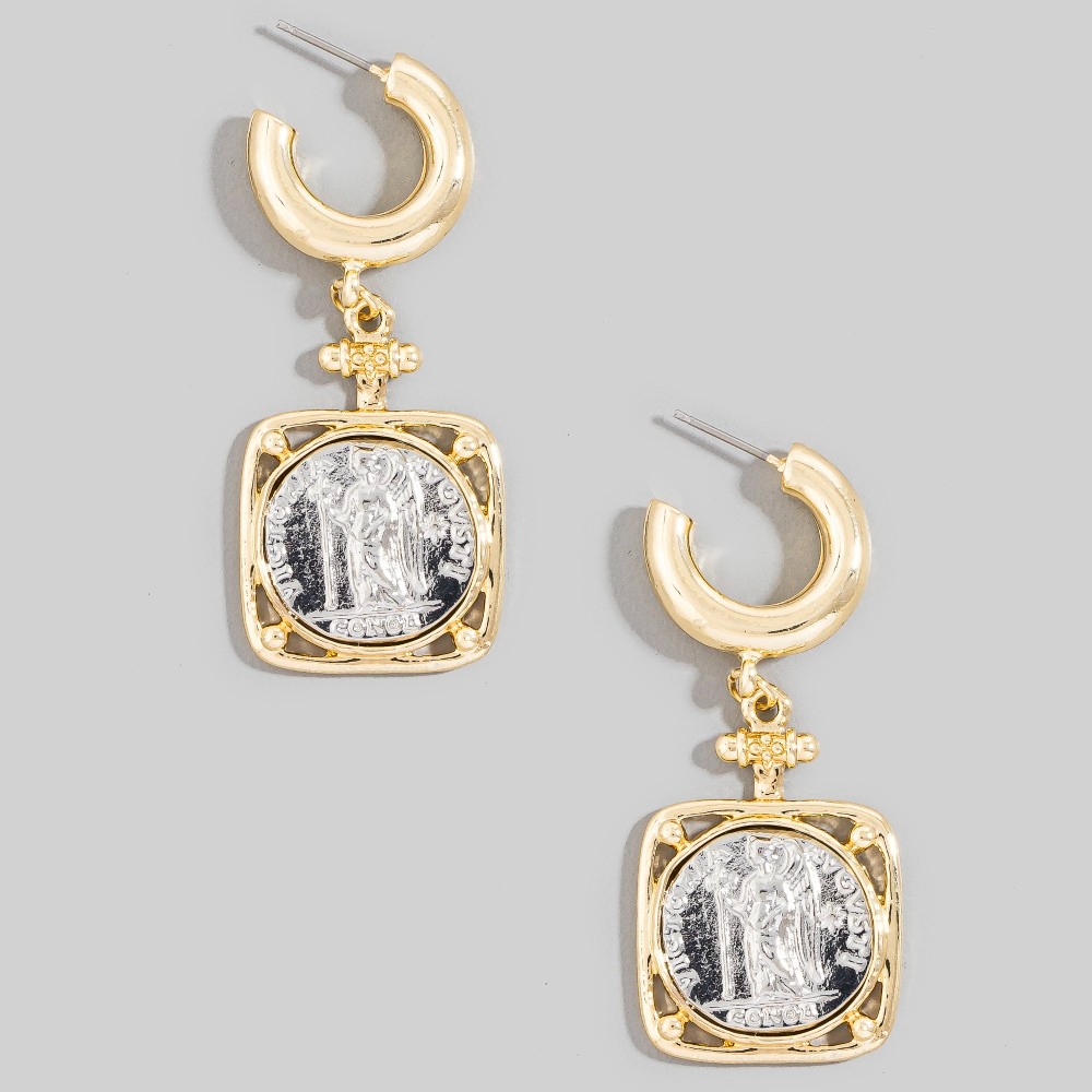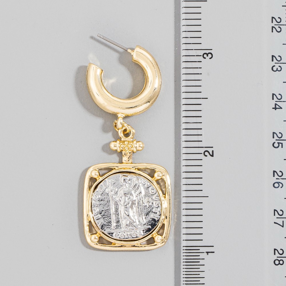• Add some edge to your wardrobe, this pair of hoop earrings showcases an alluring square two tone saint coin charm design. Experience the transformative power of this versatile pair of hoop earrings, effortlessly enhancing the overall aesthetic of your outfit. Available in GD. This item is sold in packs of 1.