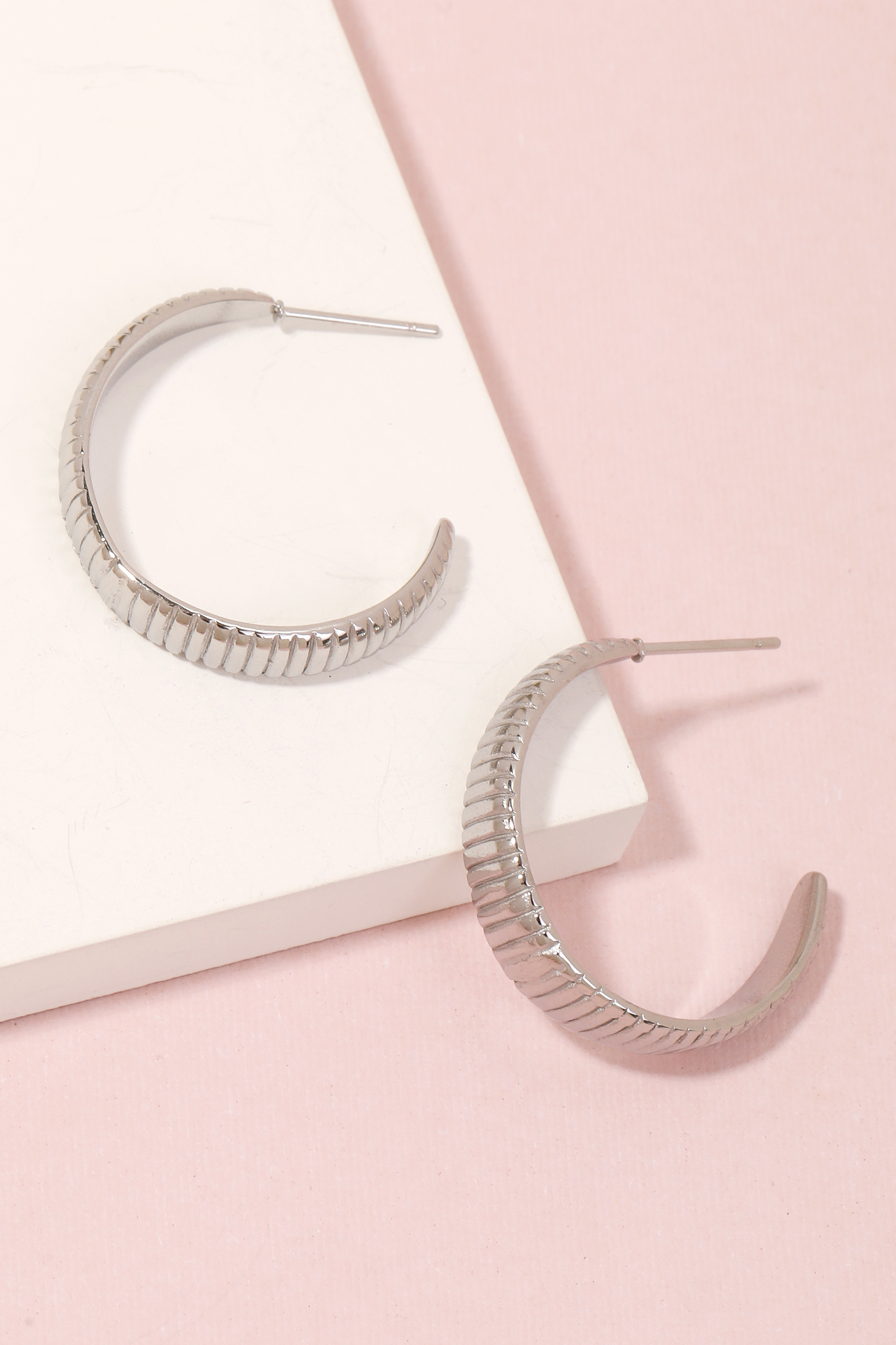 This piece is both elegant and versatile, this pair of hoop earrings offers a remarkable stainless steel ribbed texture design. Perfect for adding a touch of glamour and sophistication to any outfit, this pair of hoop earrings is a must-have. Available in G, S. This item is sold in packs of 1.