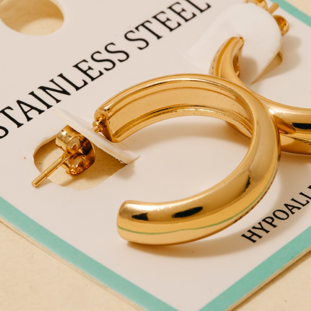 • Perfectly polished and endlessly versatile, this pair of hoop earrings offers a remarkable stainless steel rounded design. Achieve a perfect blend of style and sophistication with this versatile pair of hoop earrings, a fashion-forward choice for any occasion. Available in GD, RD. This item is sold in packs of 1.