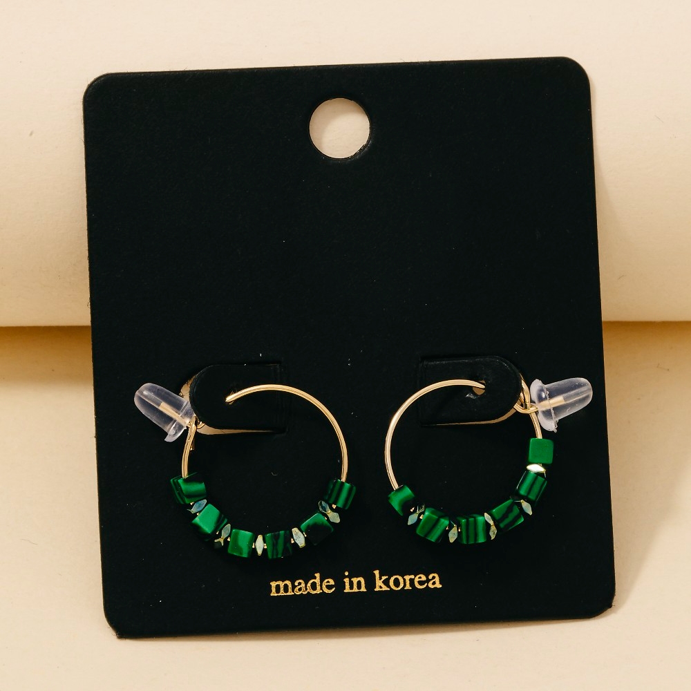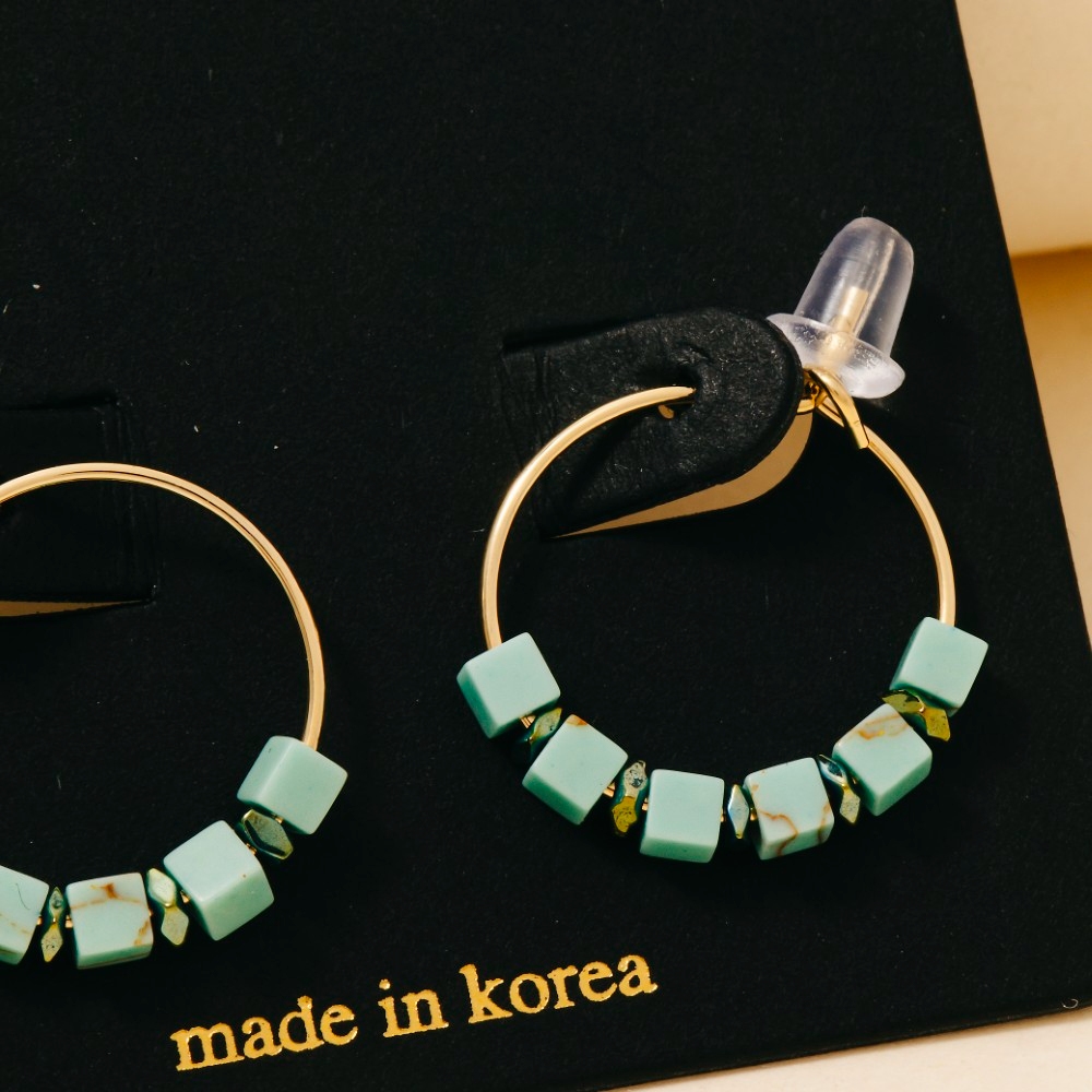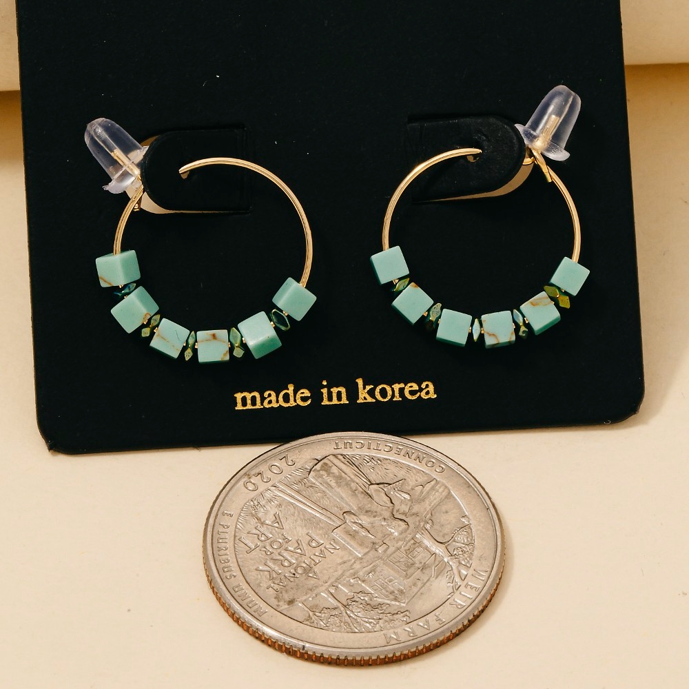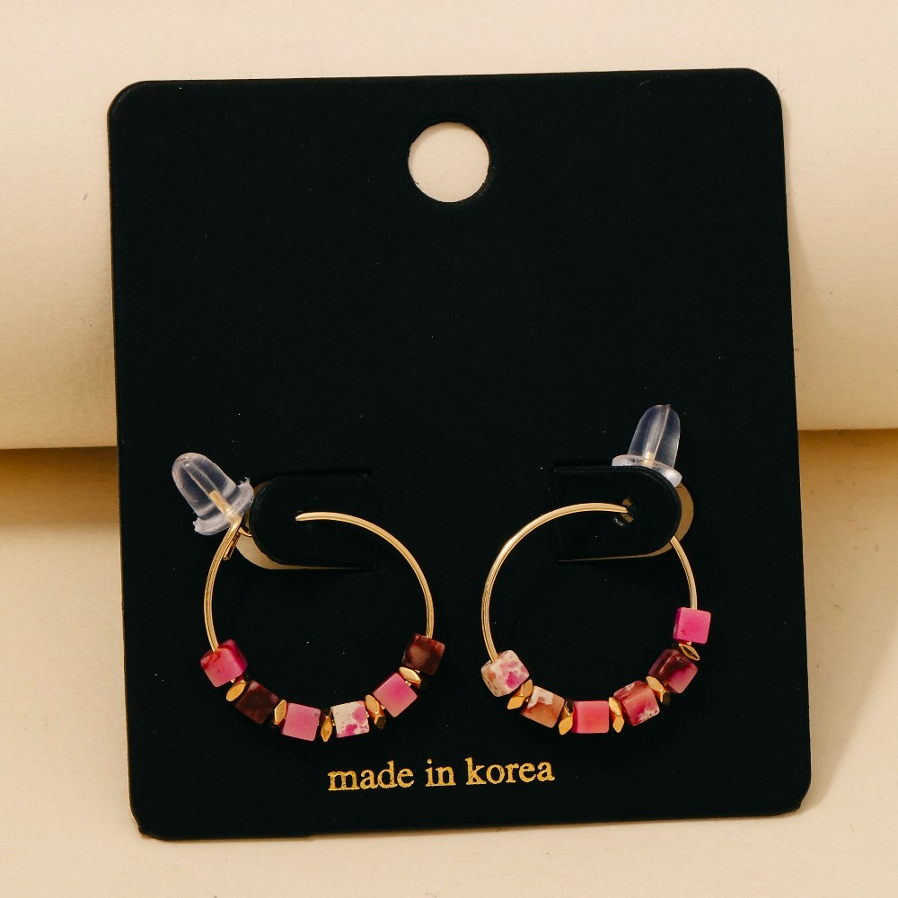 • Add some edge to your wardrobe, this pair of hoop earrings evokes a captivating stone cube beads dainty wire design. Perfect for adding some texture and dimension to any outfit, this pair of hoop earrings is a must-have. Available in GN, PK, TQ, WH. This item is sold in packs of 1.