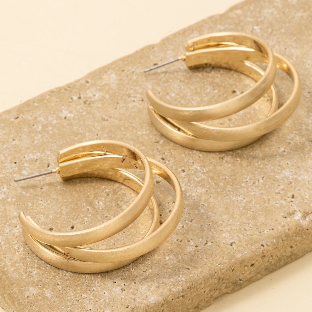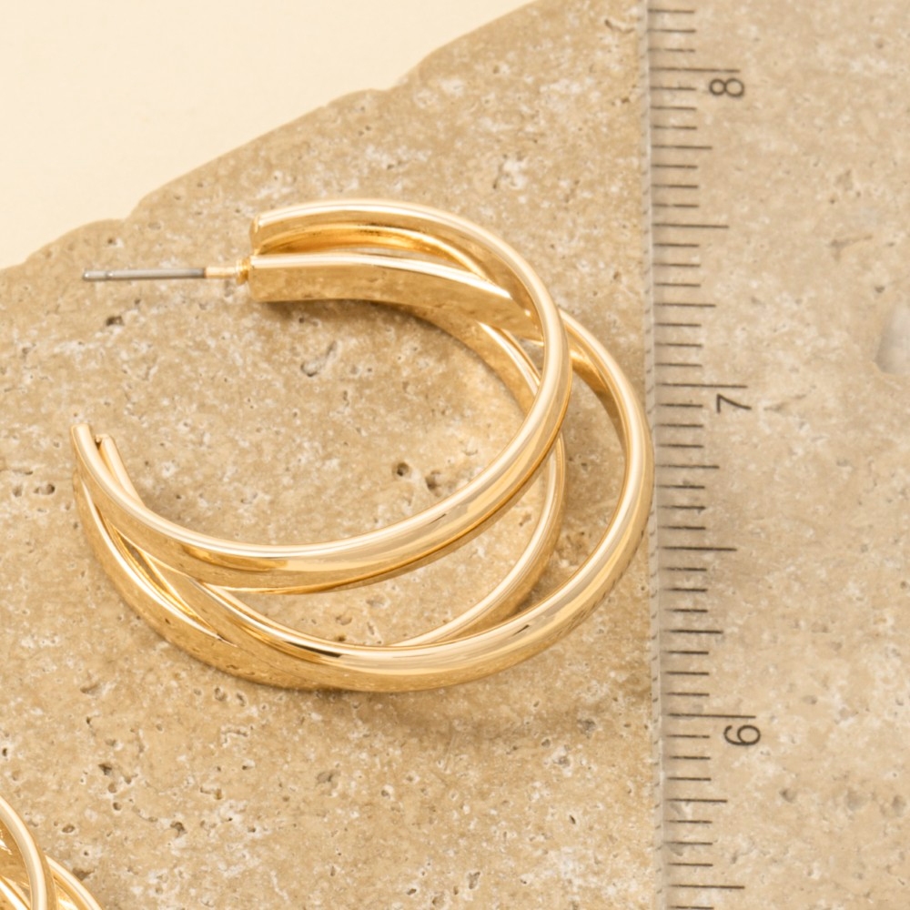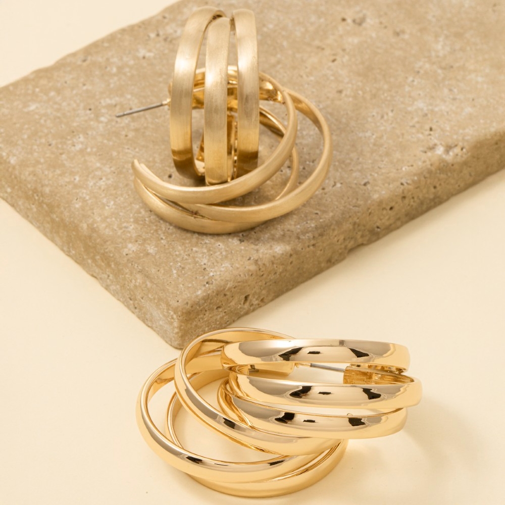 • Sleek, modern, and always stylish, this pair of hoop earrings embodies a sophisticated triple layered metallic design. Add a touch of glamour to your wardrobe with this versatile pair of hoop earrings, perfect for enhancing the elegance of any look. Available in G, MG. This item is sold in packs of 1.