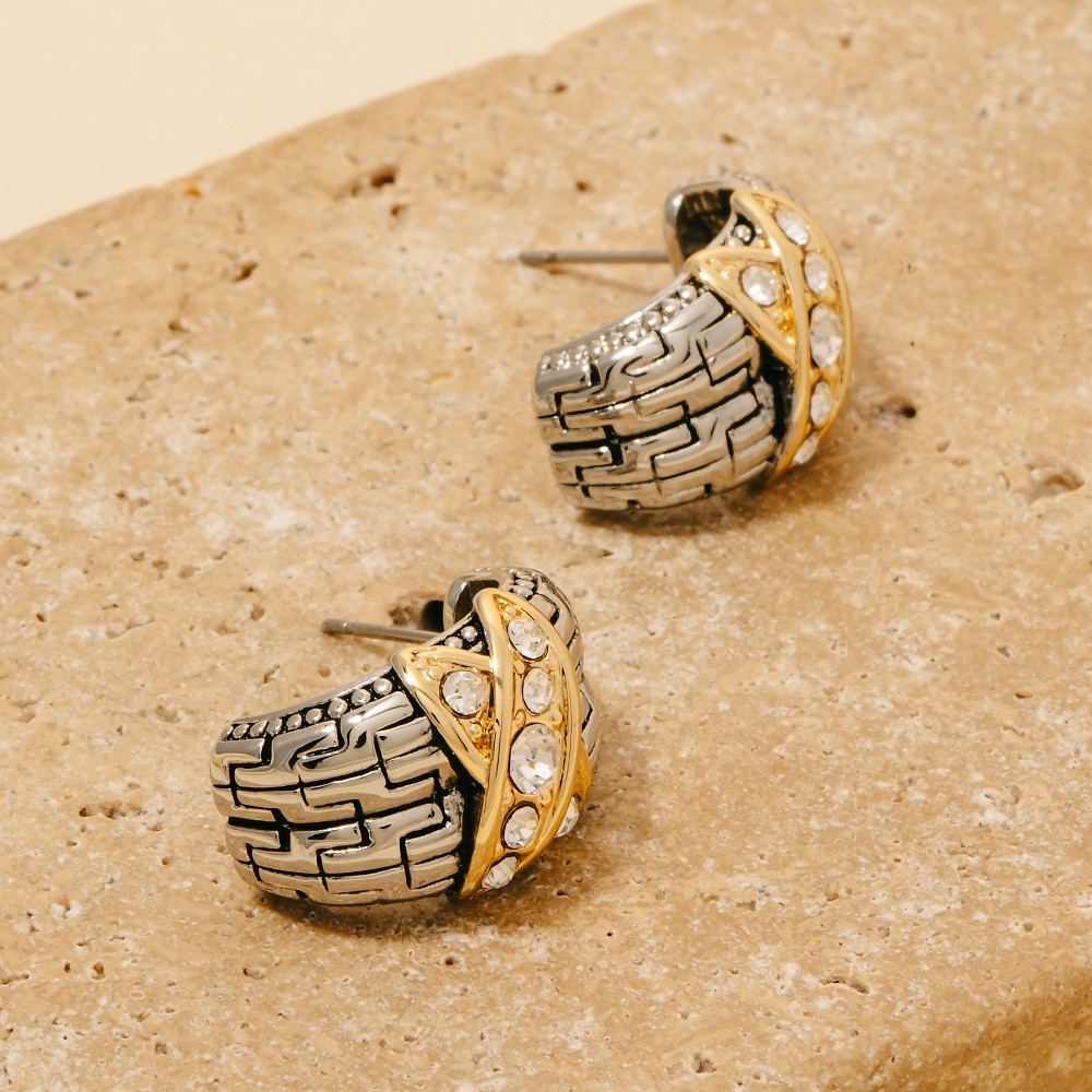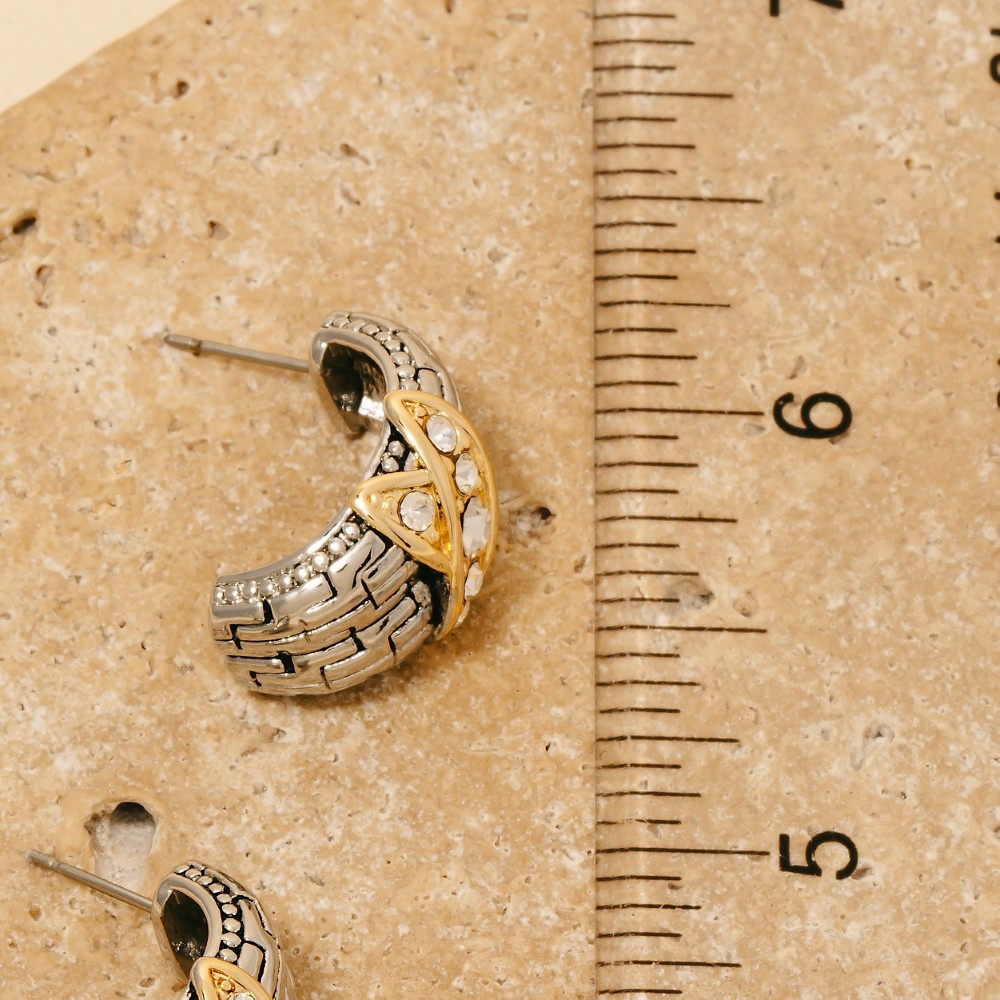 • A stunning piece that is sure to turn heads, this pair of hoop earrings highlights a special two tone cubic zirconia pave x wide textured design. Achieve a perfect balance of style and sophistication with this versatile pair of hoop earrings, the ultimate choice for the fashion-savvy individual. Available in T. This item is sold in packs of 1.