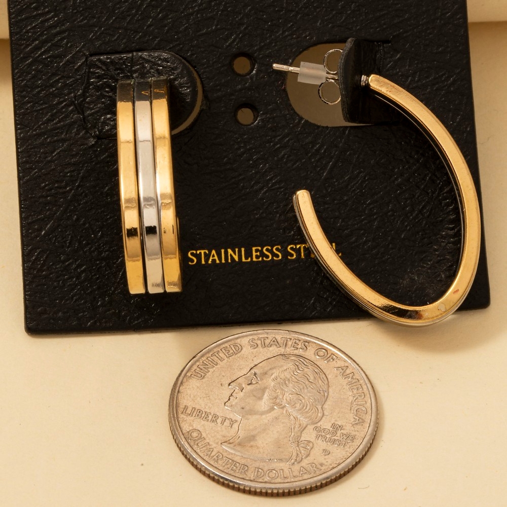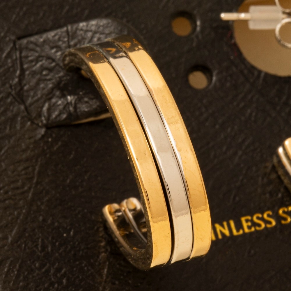 • Perfectly polished and endlessly versatile, this pair of hoop earrings embodies a sophisticated two tone stainless steel wide layered design. A stylish pair of hoop earrings that's perfect for complementing your favorite outfit. Available in GDMRH. This item is sold in packs of 1.