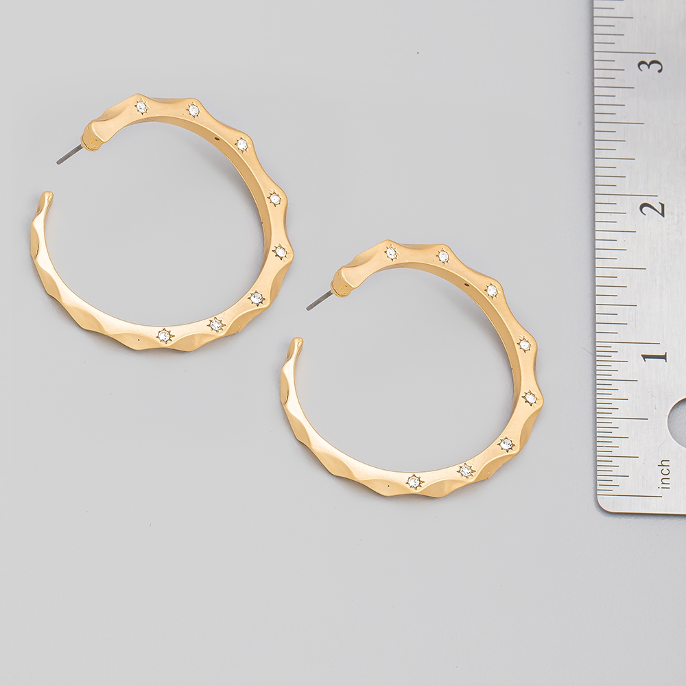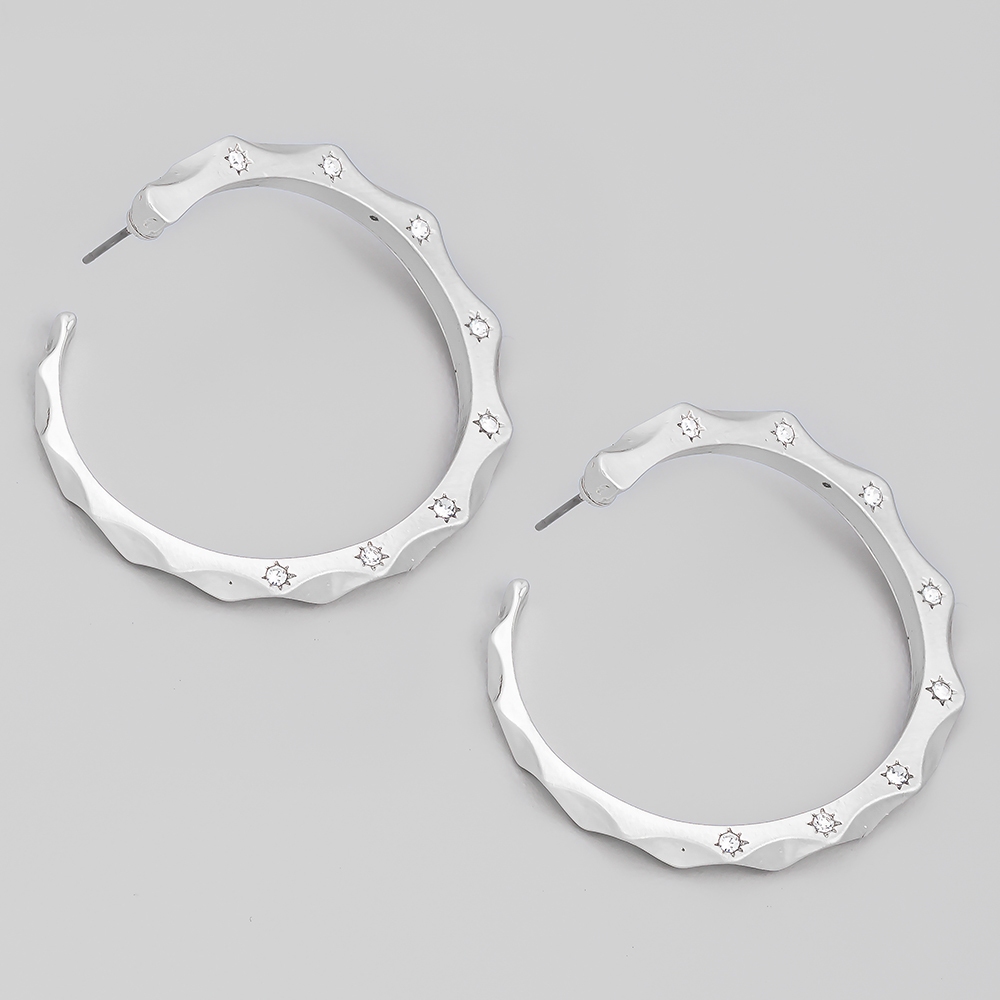 • The perfect way to add some sparkle to your outfit, this pair of hoop earrings encompasses a grand wavy round studded design. This item is ideal for those who want to add some personality to their wardrobe without being too bold. Available in SG and SS. This item is sold in packs of 1.