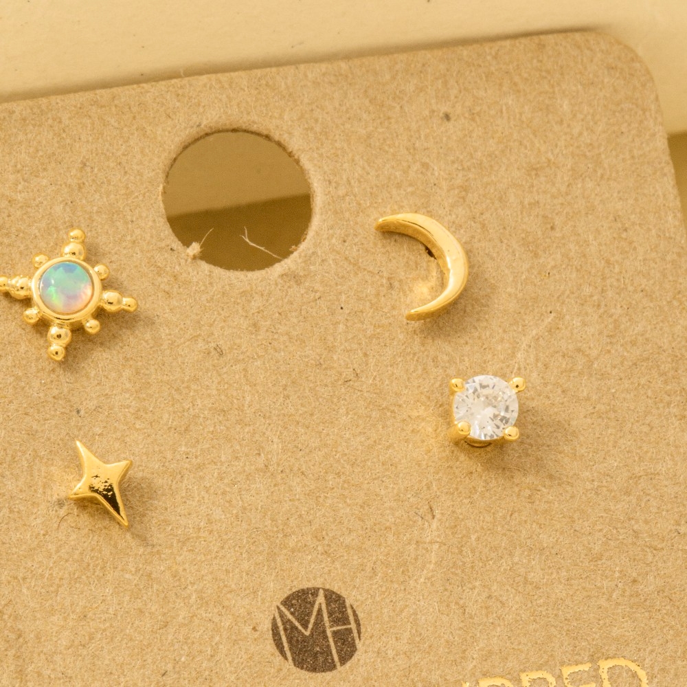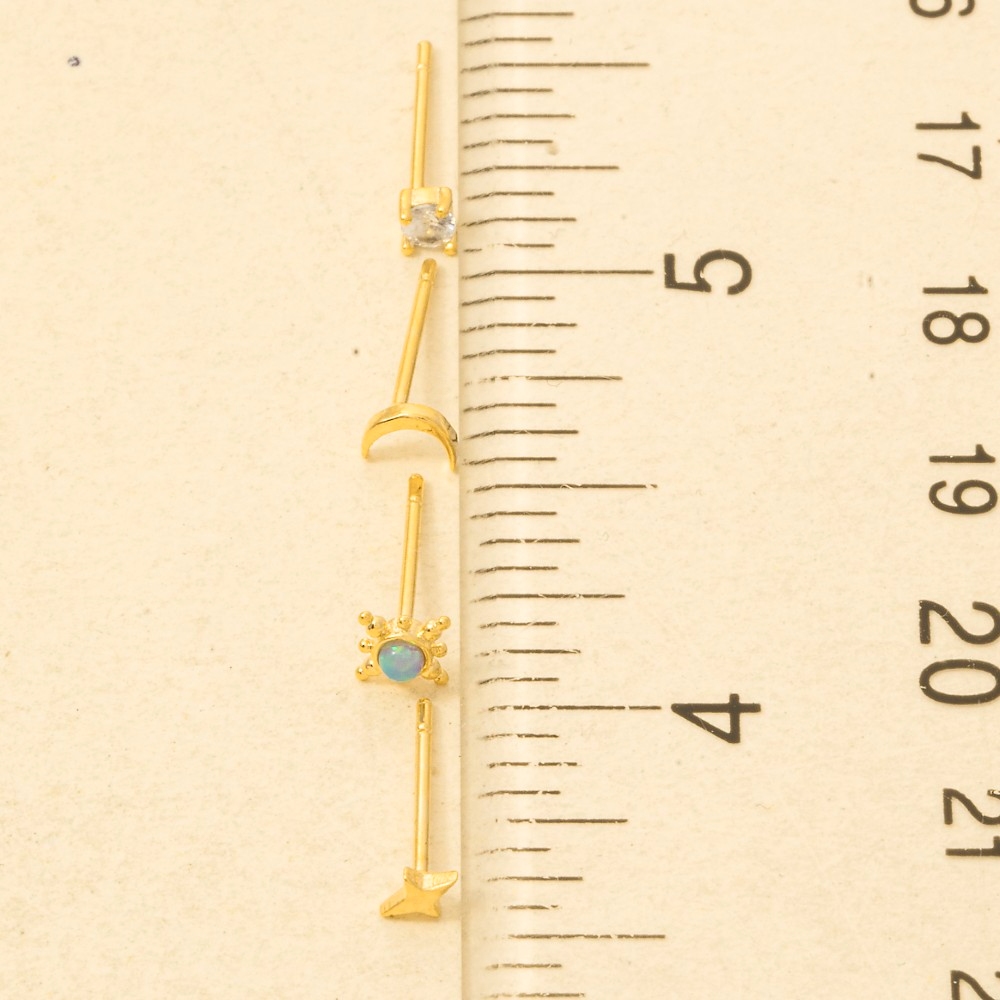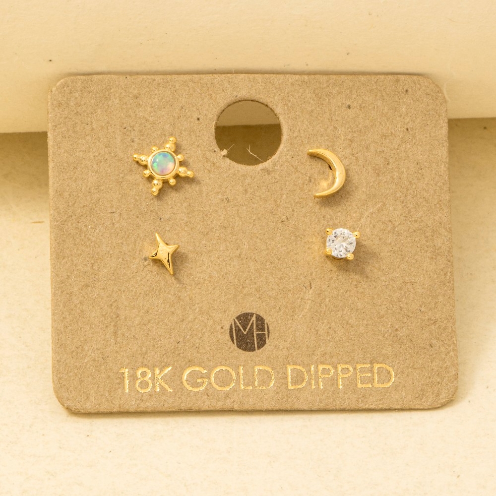 • The perfect way to add some sparkle to your outfit, this trending pair of earrings brings a one-of-a-kind gold dipped 4pc star moon stud earrings set design. Master the art of accessorizing with this versatile trending pair of earrings, a key element for achieving a chic and polished look. Available in G. This item is sold in packs of 12.