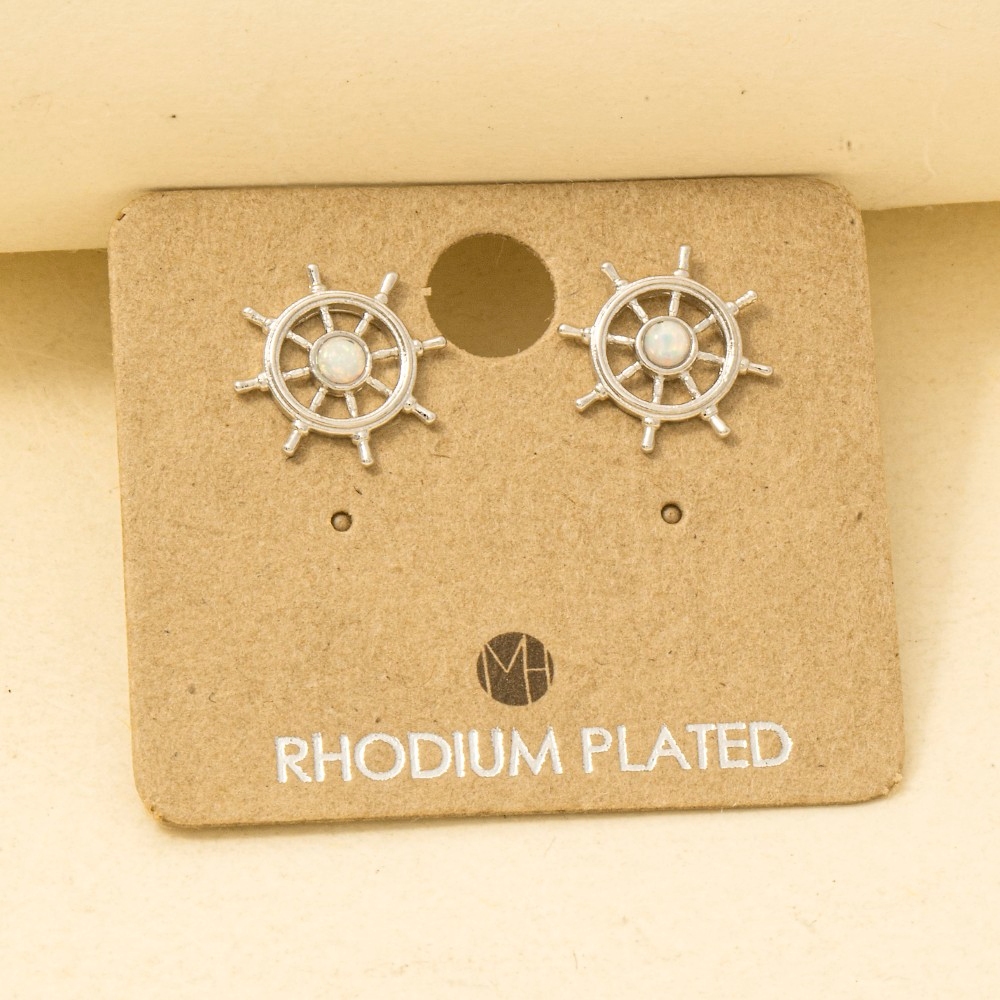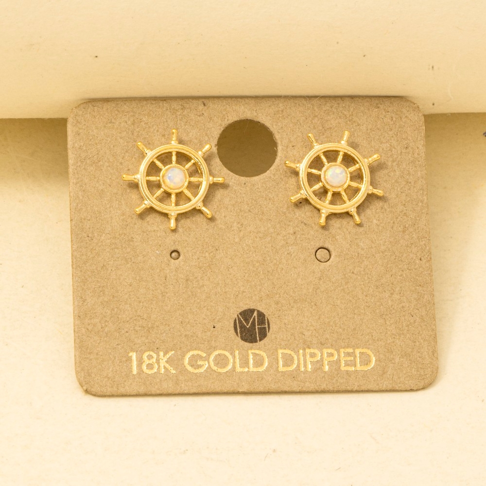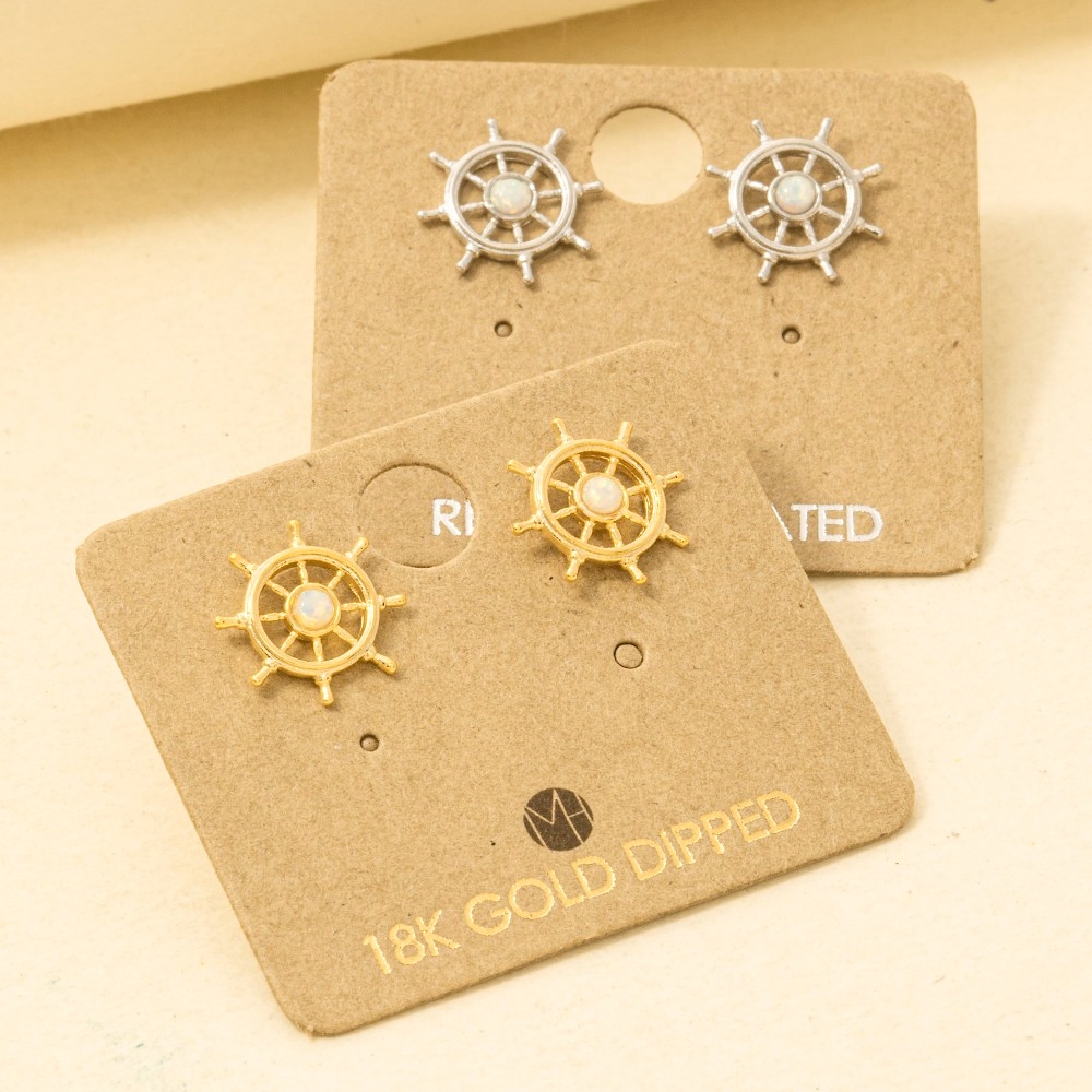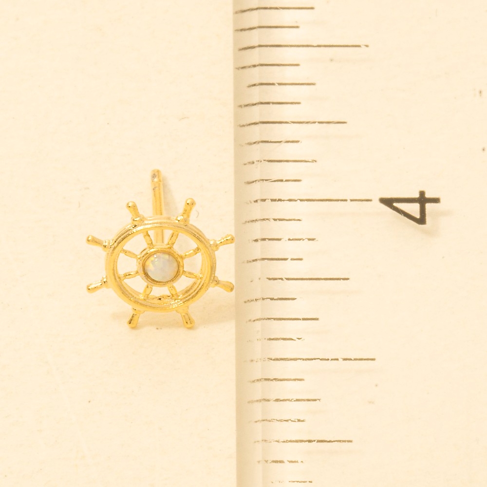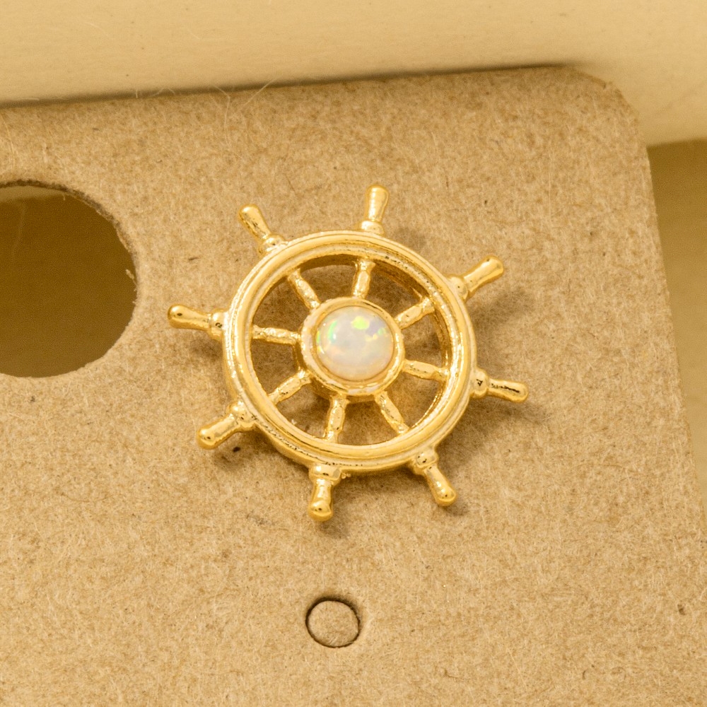 A versatile and stylish addition to any wardrobe, this trending pair of earrings radiates a sleek gold dipped opal stud ship wheel stud earrings design. A must-have trending pair of earrings that effortlessly enhances your style, no matter the occasion. Available in G, S. This item is sold in packs of 1.