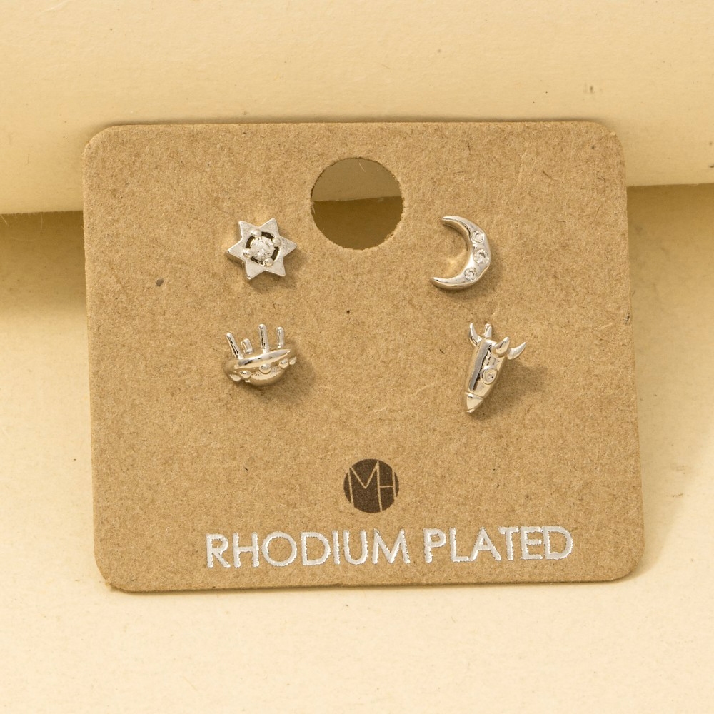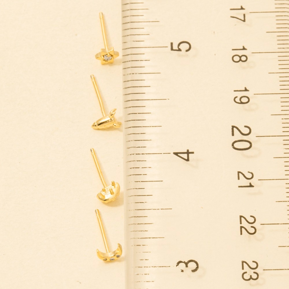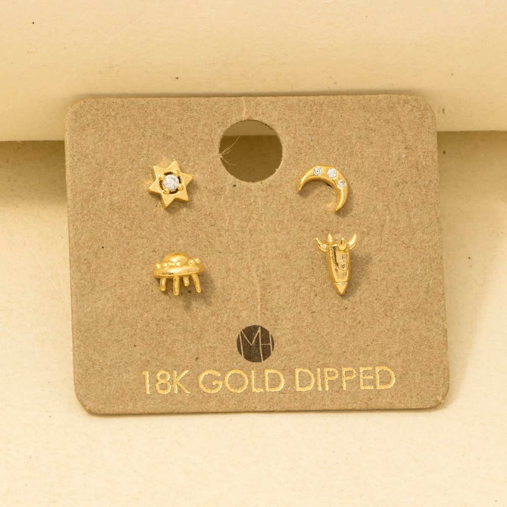 • Bold, daring, and endlessly stylish, this trending pair of earrings presents a striking gold dipped space themed stud earrings set design. Elevate your outfit with this stylish trending pair of earrings that's perfect for any occasion. Available in G, S. This item is sold in packs of 1.