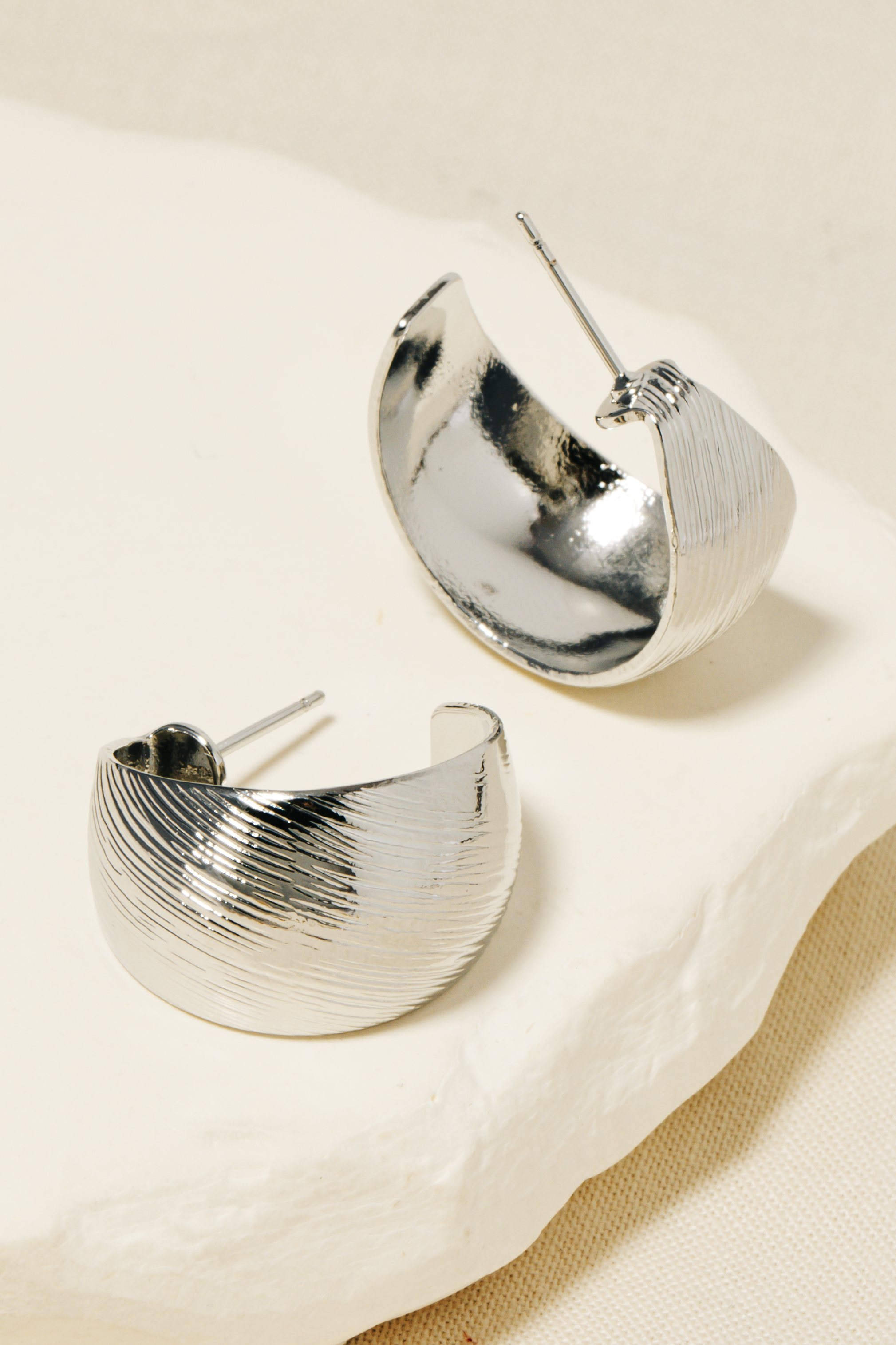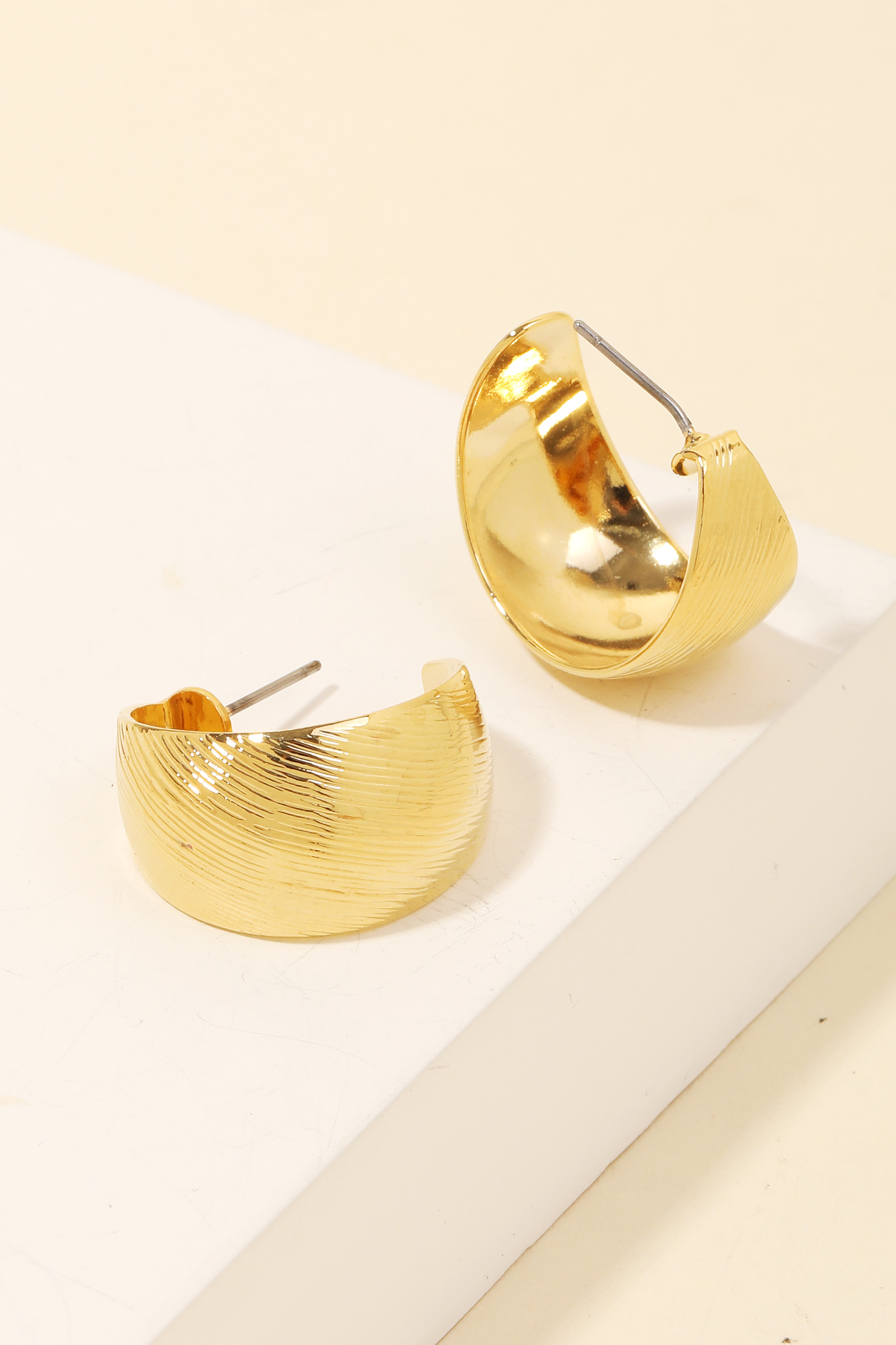 - Perfect for any fashion-forward individual, this pair of hoop earrings shows off a distinctive brushed metallic design. The perfect accessory for completing any outfit, whether you're dressing up or keeping it casual. Available in G. This item is sold in packs of 1.