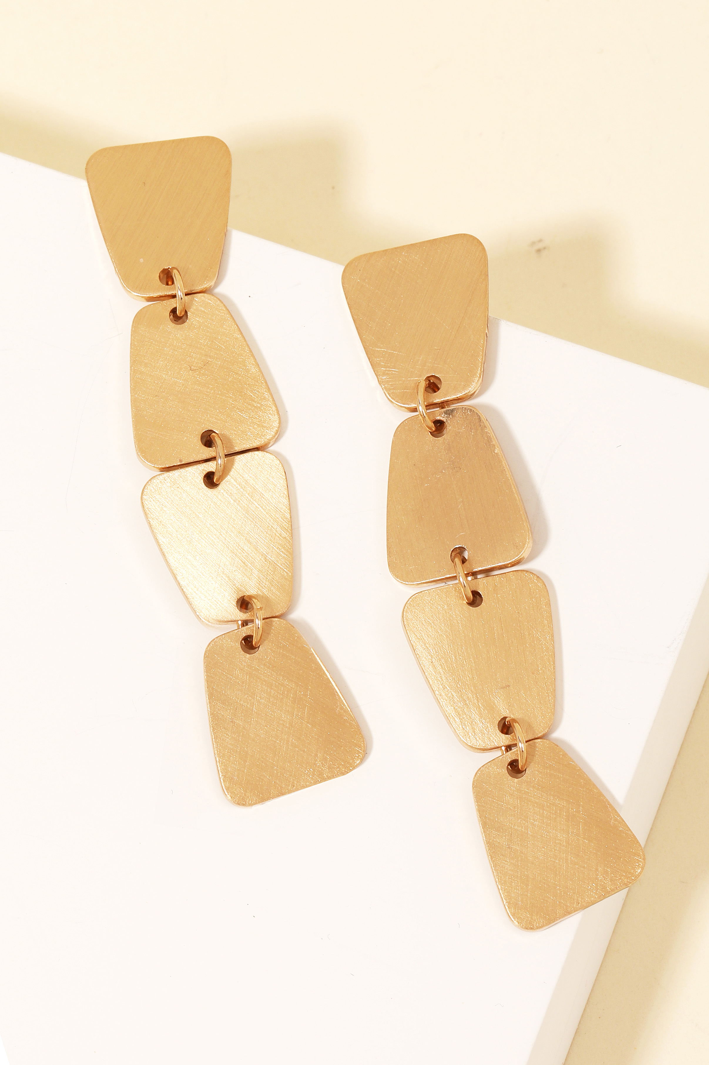 - Perfect for any fashion-forward individual, this pair of dangle earrings radiates a sleek brushed metallic shapes dangle earrings design. This accessory is an effortless way to add some personality to your outfit. Available in MG. This item is sold in packs of 1.