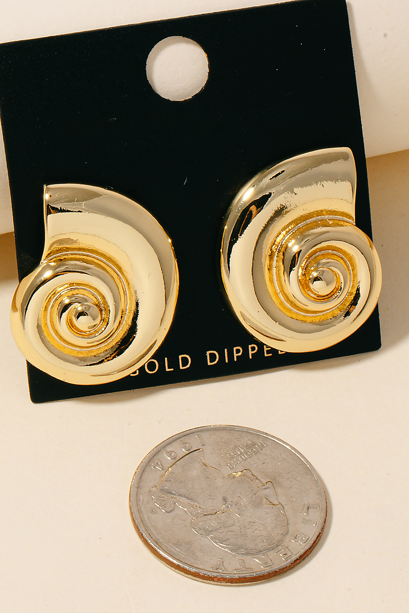 • This pair of stud earrings showcases a timeless gold dipped snail shell style. Celebrate the art of accessorizing with this piece that effortlessly encapsulates modern trends.