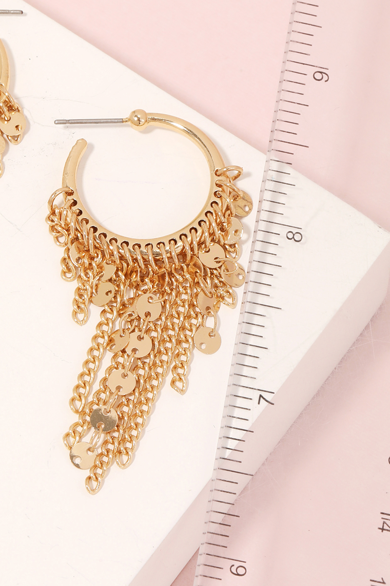 • Perfect for any fashion-forward individual, this pair of hoop earrings features a distinct metallic chain fringe hoop earrings design. Perfect for dressing up or down, this versatile accessory adds a touch of sophistication to any look. Available in XG. This item is sold in packs of 1.