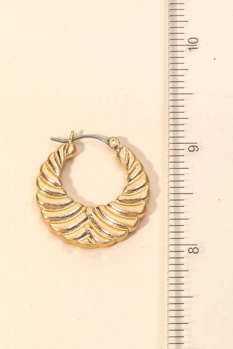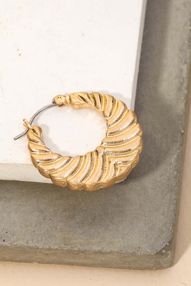 A charming chic unique must have trending in season pair of hoop earrings that is made with a metallic crossaint hoop earrings design. A must have in season accessory for this Spring season! Available in G.