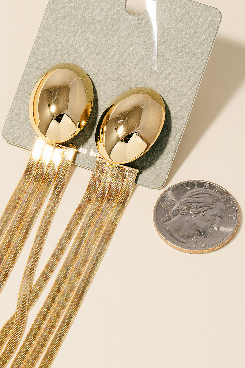 Effortlessly elevate your style, this pair of drop earrings contains a special oval shield long flat chain fringe design. Infuse a hint of luxury into your daily attire with this versatile pair of drop earrings, a must-have for those who appreciate timeless elegance. Available in G. This item is sold in packs of 1.