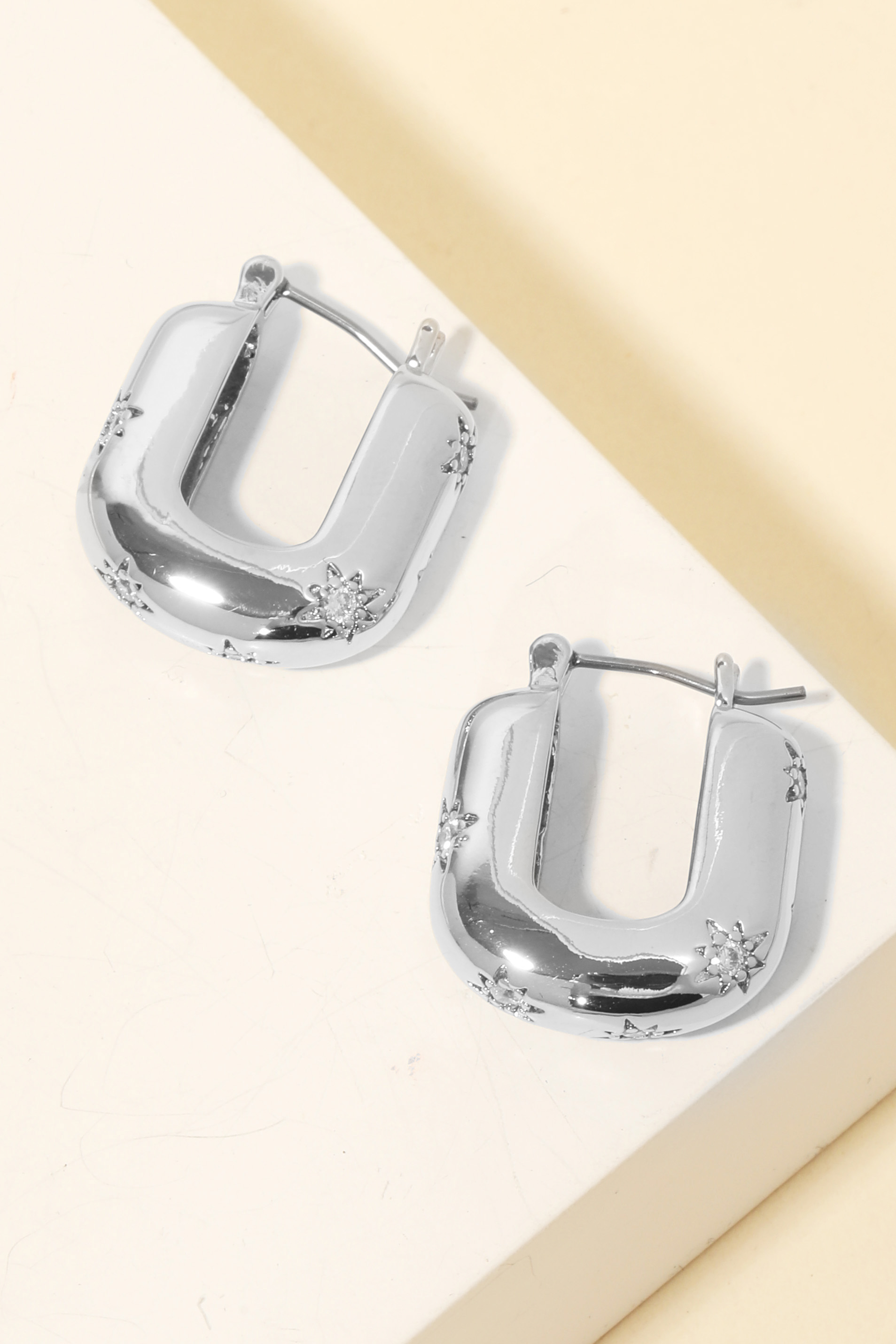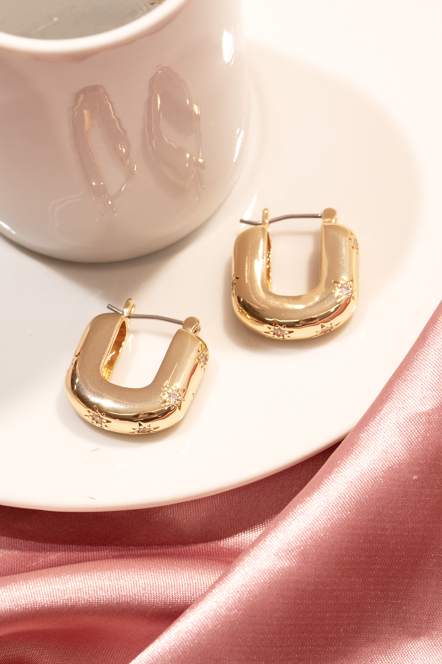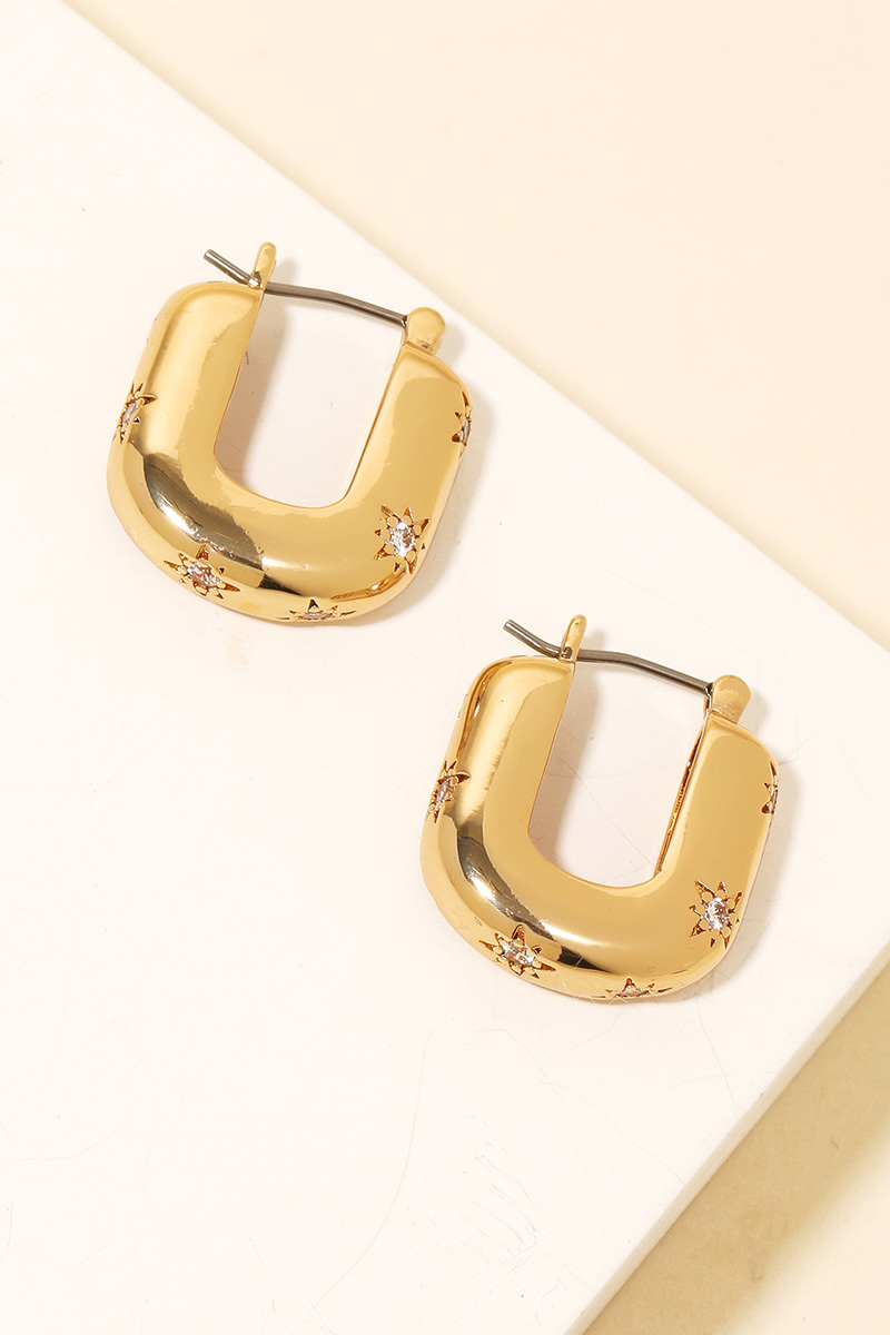 • Guaranteed to add a touch of glamour to any outfit, this pair of hoop earrings comes with a special star engraved rectangle hoop earrings design. It also includes studded engraving. Achieve a perfect blend of style and sophistication with this versatile accessory, a fashion-forward choice for any occasion. Available in G. This item is sold in packs of 1.