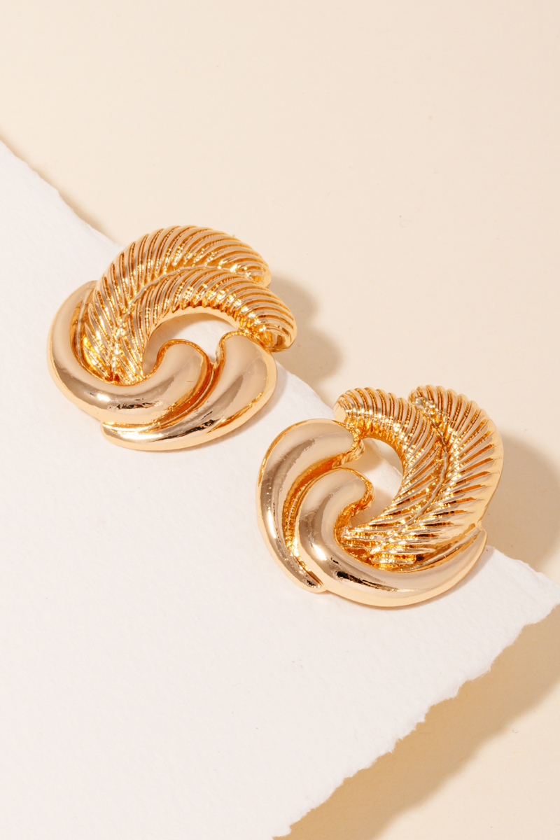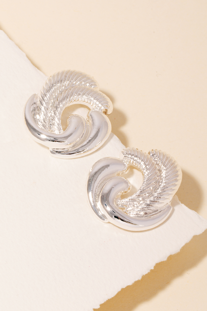 • A stunning piece that is sure to turn heads, this pair of stud earrings encompasses a grand textured metallic wave swirl design. A must-have pair of stud earrings for anyone who loves to add some flair to their outfits. Available in GD and SV. This item is sold in packs of 1.