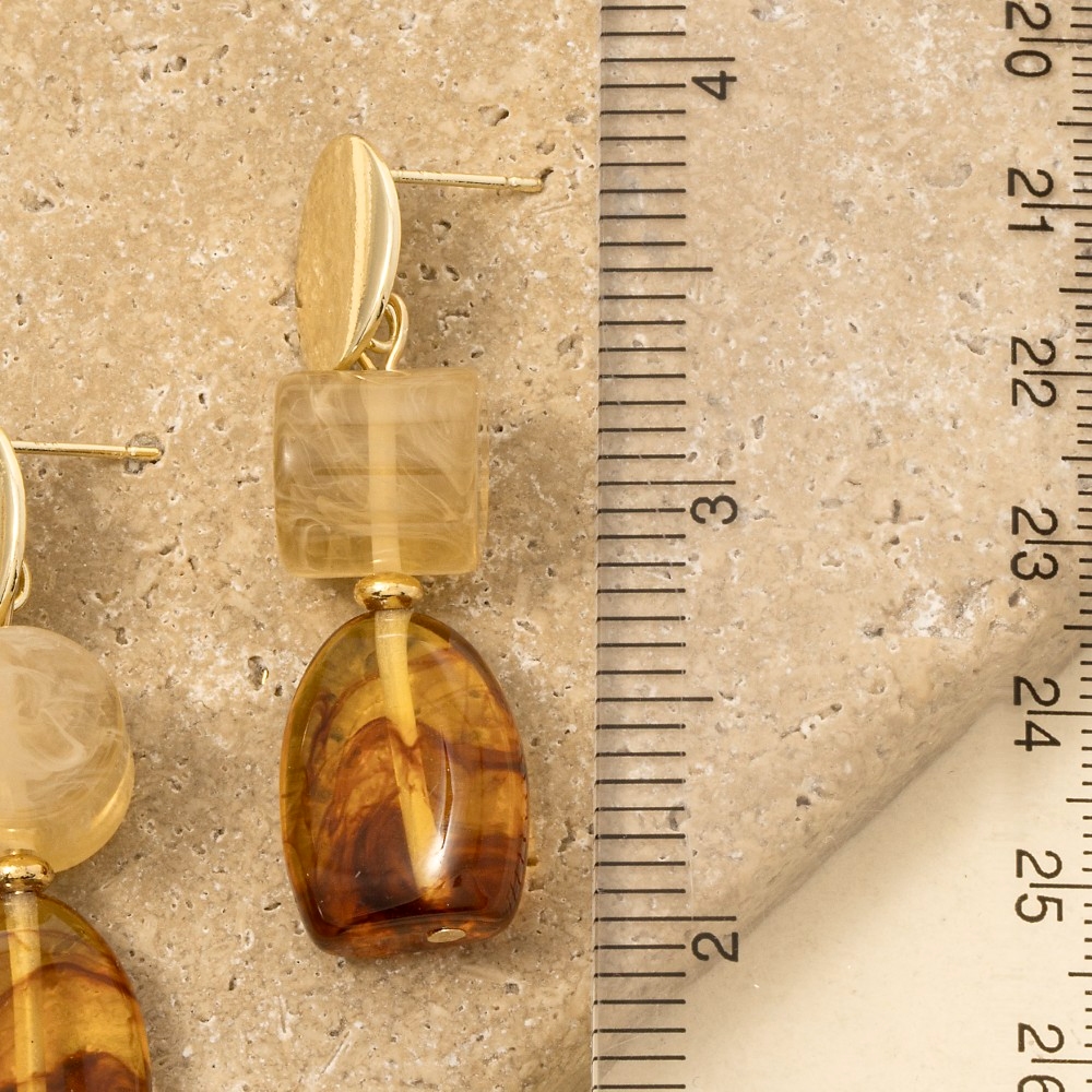 Stay on-trend and stand out from the crowd, this pair of drop earrings radiates a sleek resin geo shaped layered design. Elevate your fashion ensemble effortlessly with this versatile pair of drop earrings, a stylish choice for the modern trendsetter. Available in MBRG2. This item is sold in packs of 1.
