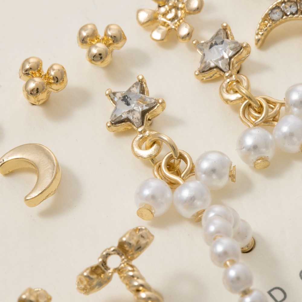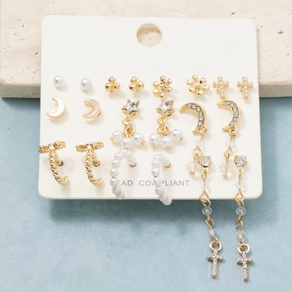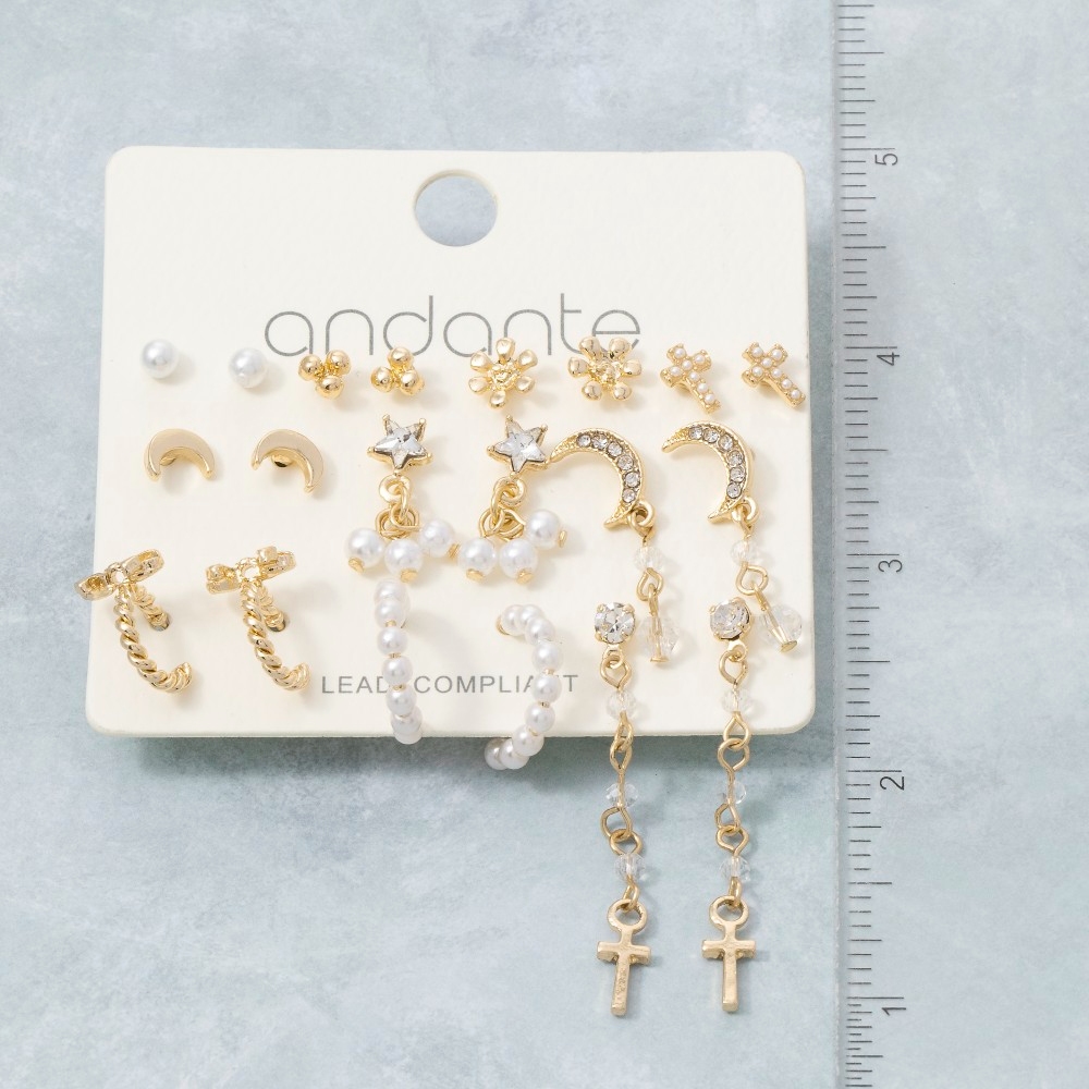 - Stay on-trend and ahead of the fashion curve, this pair of earrings boasts a magnificent pearl stars and moon 10 pair set design. This item is the perfect finishing touch to any outfit, adding a touch of glamour and sophistication. Available in G. This item is sold in packs of 1.