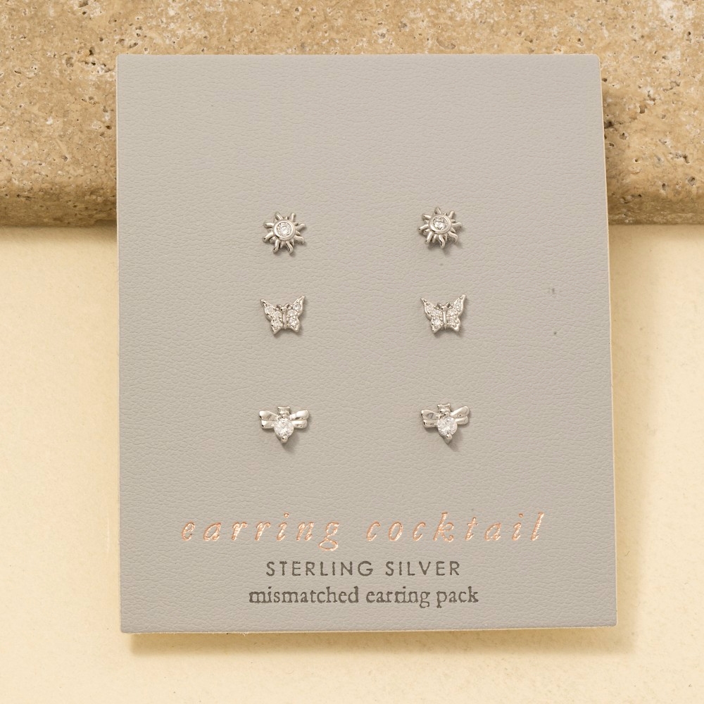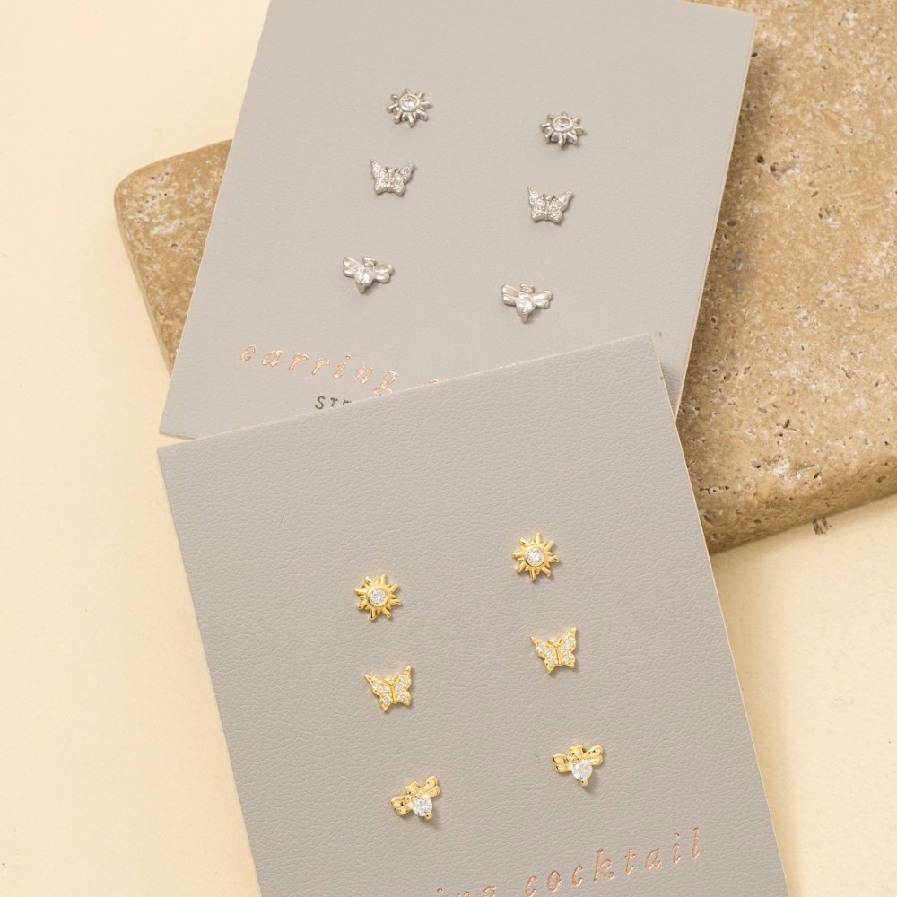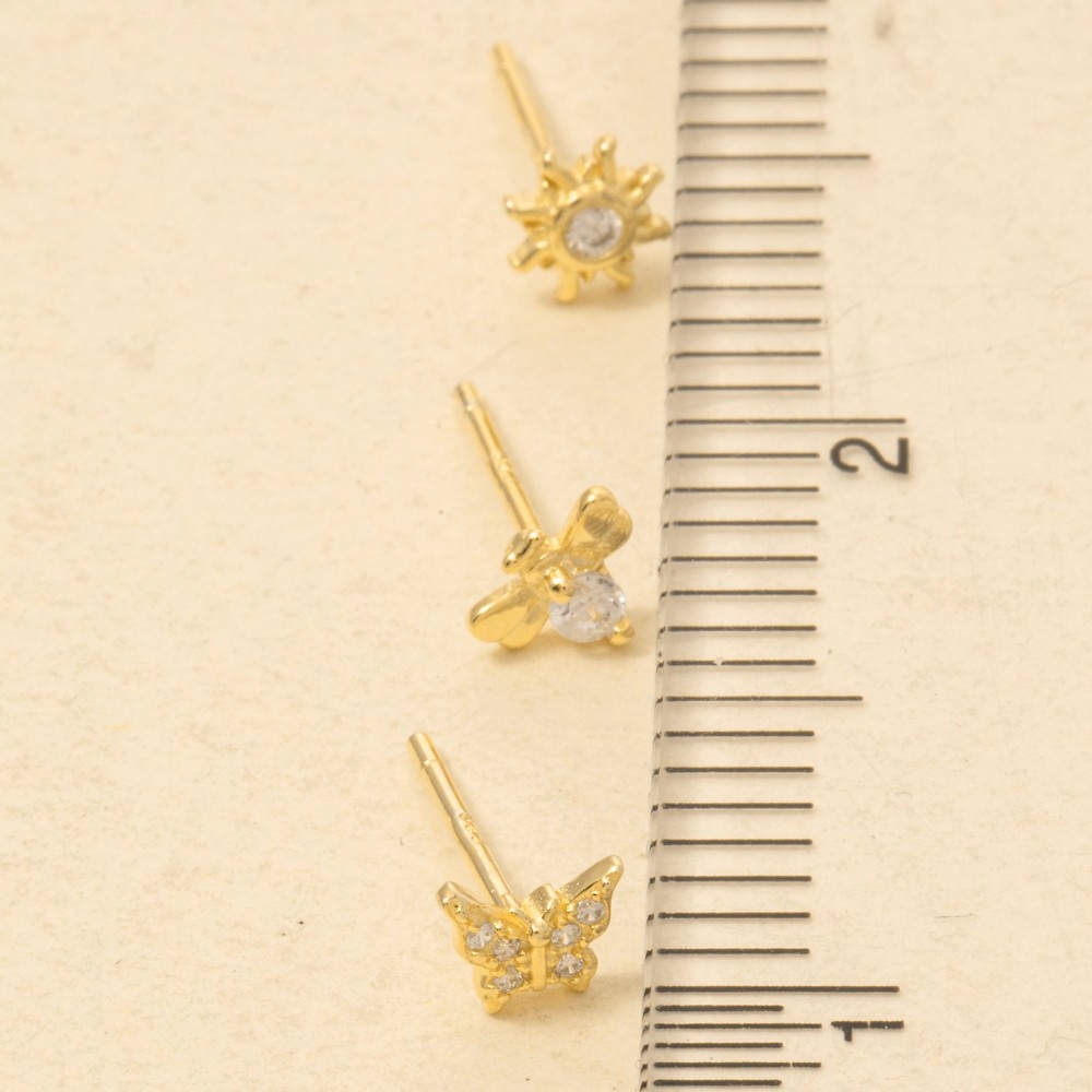 • This season's hottest pair of stud earrings, this pair of stud earrings displays a unique sterling silver cubic zirconia butterfly sun and bee set design. This versatile pair of stud earrings adds a touch of elegance to any outfit. Available in GZ, RZ. This item is sold in packs of 1.