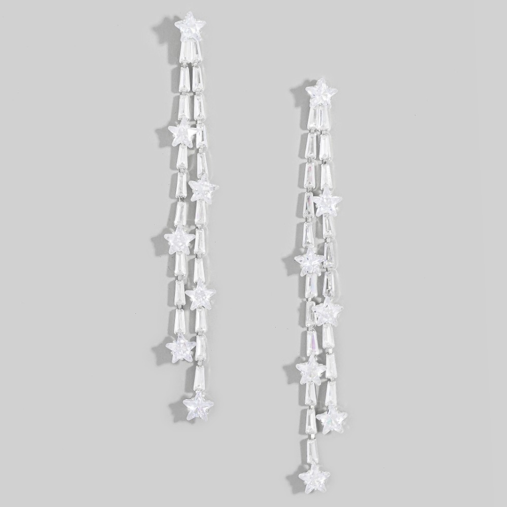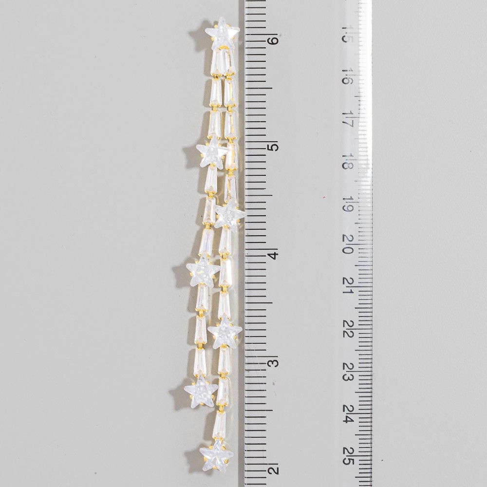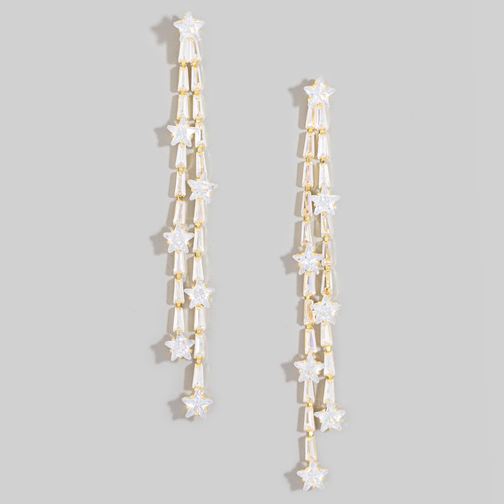 • This piece is both elegant and versatile, this pair of dangle earrings showcases a breathtaking star and baguette gems chain design. This item is perfect for anyone who loves to accessorize and add some personality to their outfits. Available in GP, RH. This item is sold in packs of 1.
