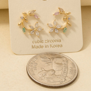 Gold Dipped Cz Leaf And Flower Circle Stud Earrings