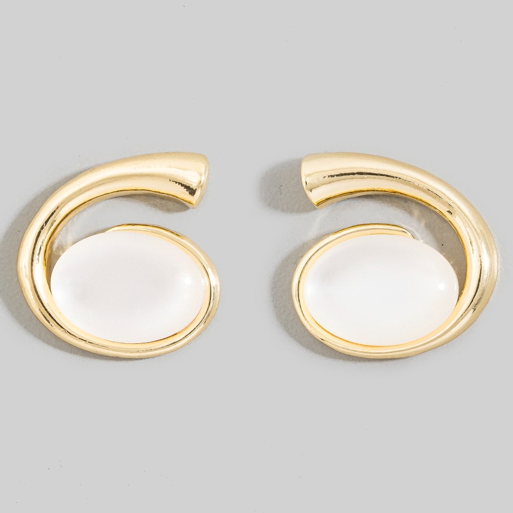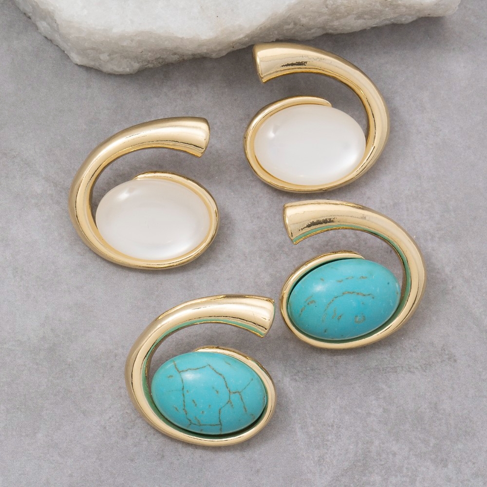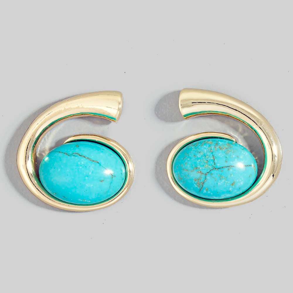 - Unleash your inner fashionista, this pair of stud earrings evokes a captivating abstract oval turquoise stone design. The perfect way to elevate any outfit, this pair of stud earrings adds a touch of elegance and style. Available in GTQ, GWH. This item is sold in packs of 1.