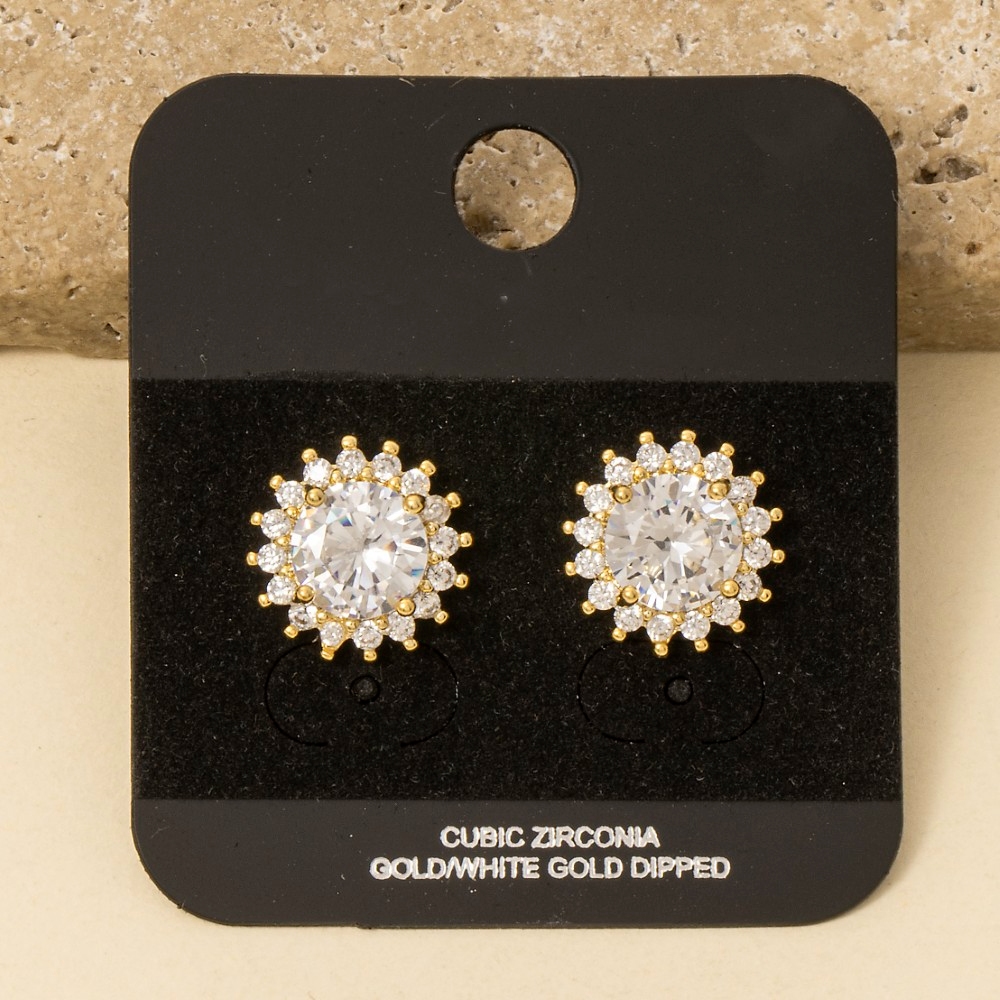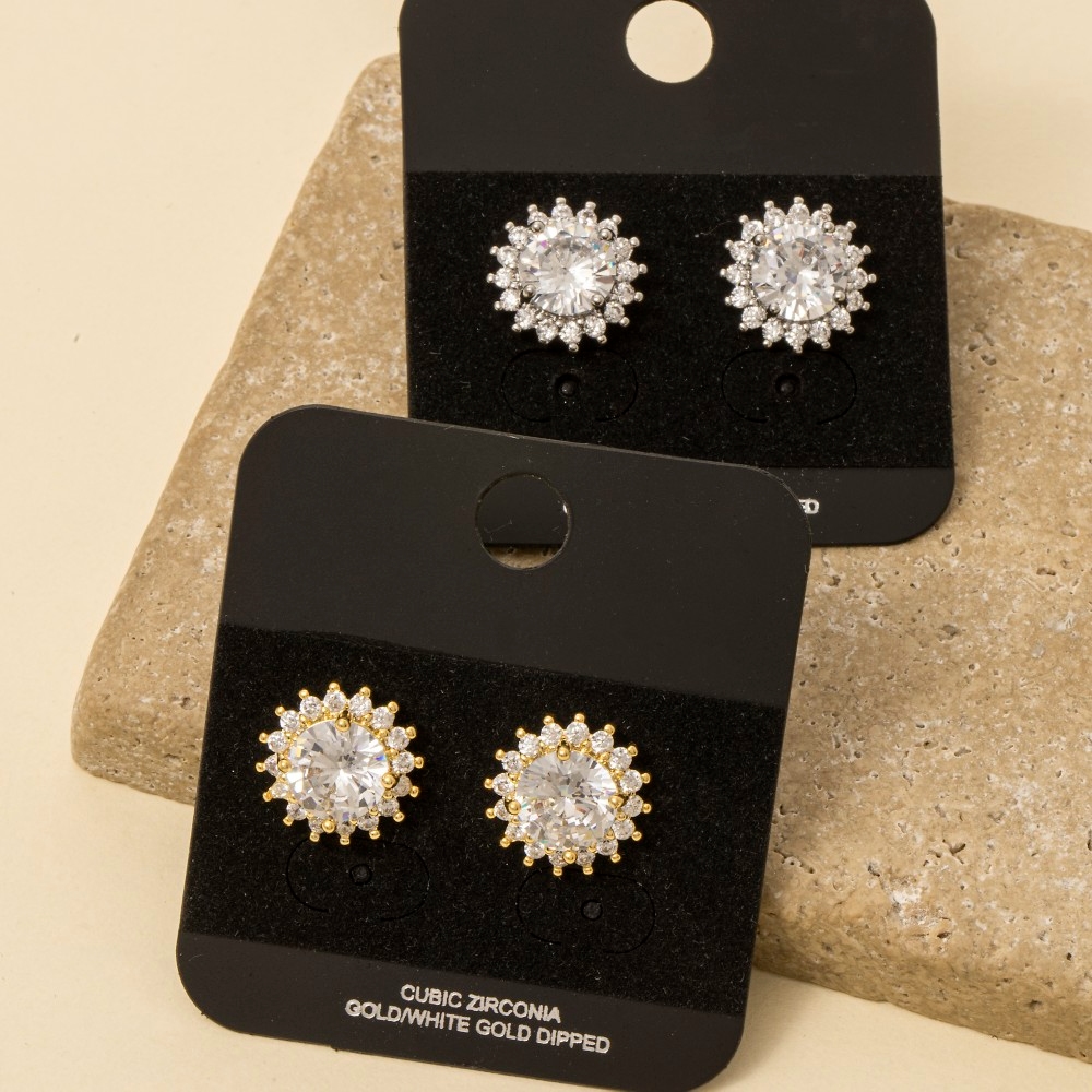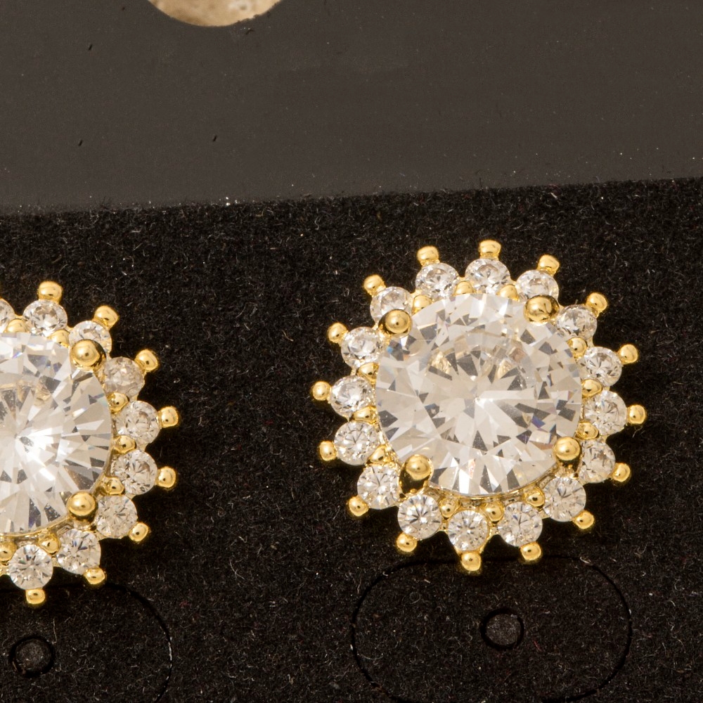 • Effortlessly elevate your style, this pair of stud earrings introduces an exceptional gold dipped large cubic zirconia sun design. A stylish pair of stud earrings that's perfect for complementing your favorite outfit. Available in G, RH. This item is sold in packs of 1.