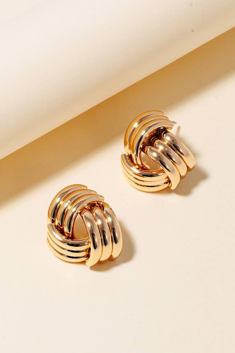 - A versatile and stylish addition to any wardrobe, this pair of stud earrings flaunts a luxurious layered metallic knot design. A must-have pair of stud earrings for anyone who loves to add some flair to their outfits. Available in GD and SV. This item is sold in packs of 1.