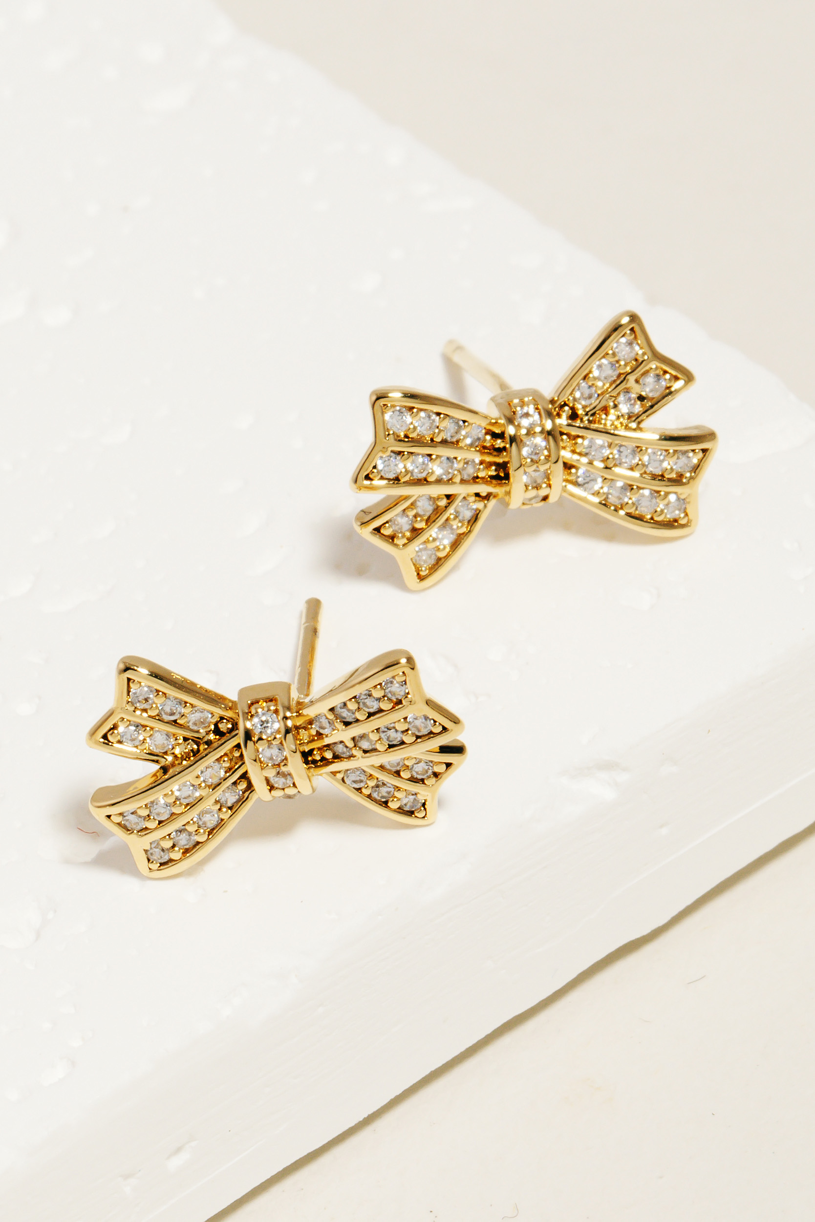 Gold Dipped Cz Pave Bow Ribbon Stud Earrings